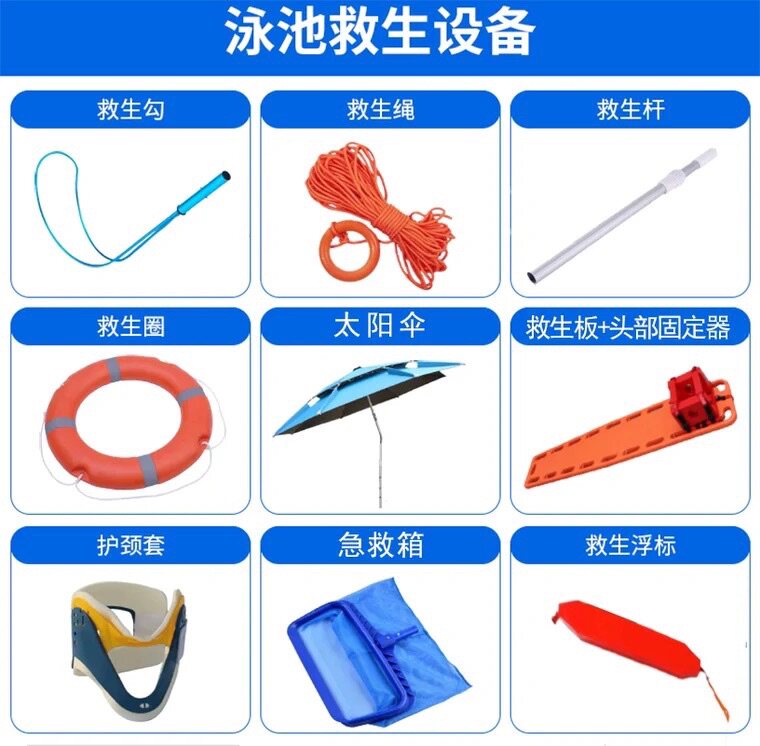 Oxygen bag, life jacket, life buoy, life rope, 20 m first aid box, neck guard, life aid stretcher, sunshade, first aid board, head fixator, buoy, neck guard, double buoy, first aid board, head fixator