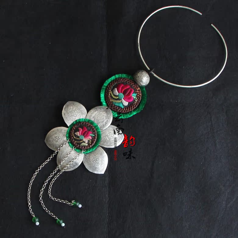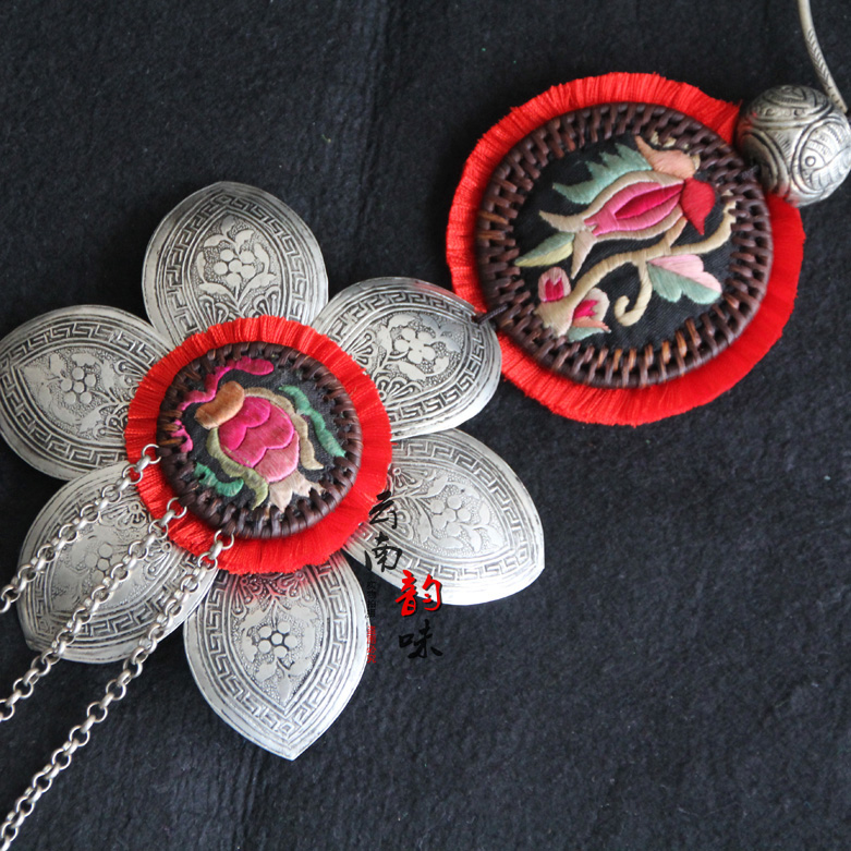 Yunnan retro national wind exaggerated Miao silver large item ring embroidered pendant necklace with female original ornament old embroidered handmade embroidery