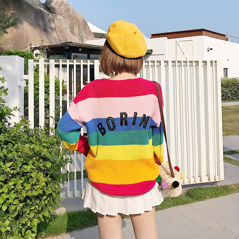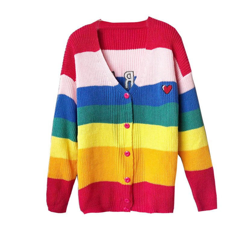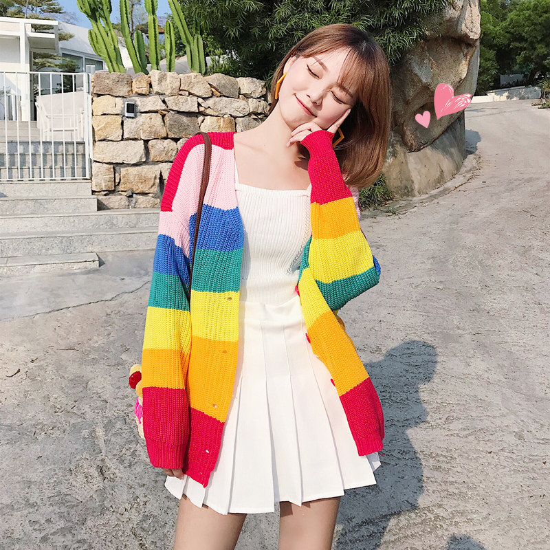 Rainbow sweater women's 2020 spring and Autumn Korean edition loose shag wool coat small fresh sweater cardigan outer wear