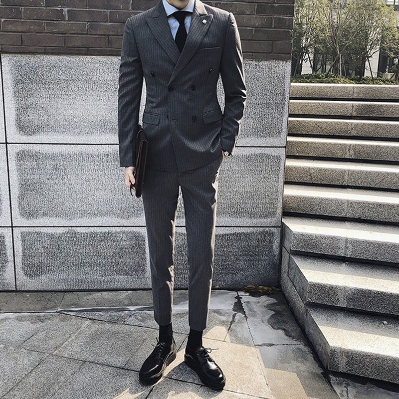 Men's suit suit striped double row button Korean version trendy Inn Wind two-piece set wedding gown small suit
