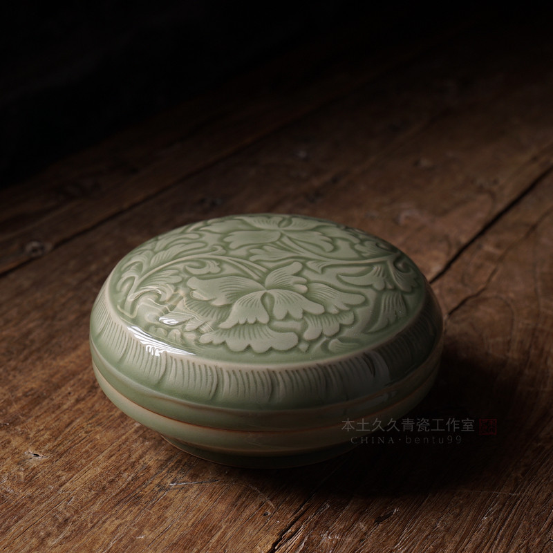 Chen Xianming Long kiln Longquan Qingqing Porcelain Traditional Firewood Burning Crafts Pure Handmade Indonesia Box Pendulum with Peony Powder box
