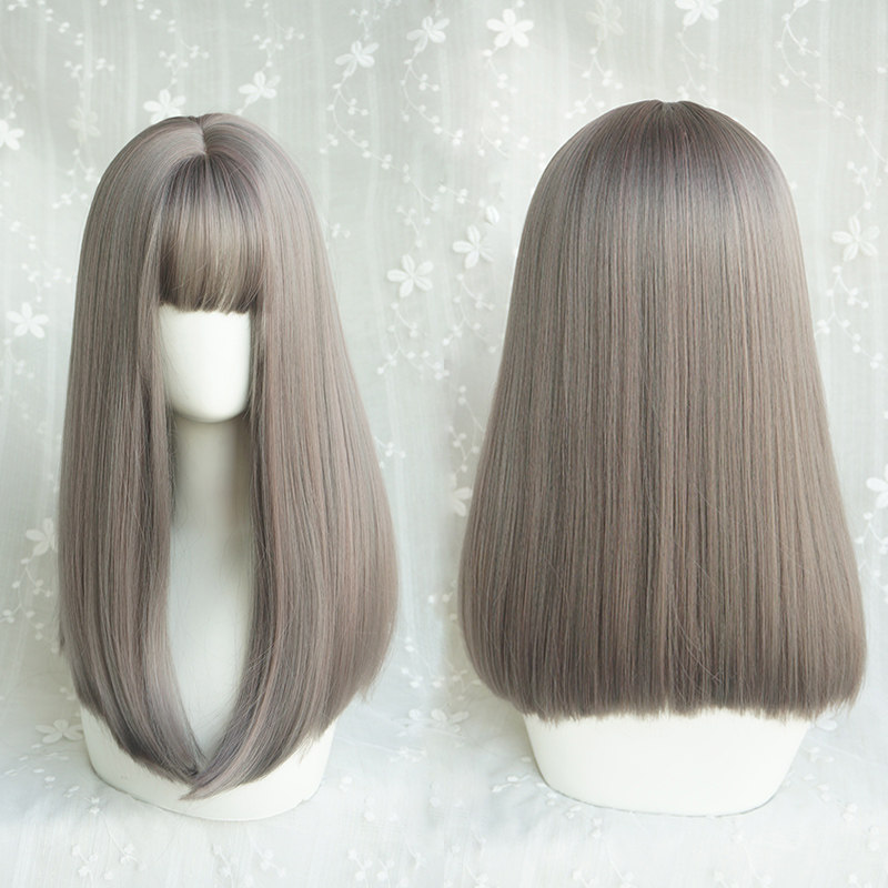 Wig female long straight hair round face clavicle hair Gray air bangs fluffy natural net red cute full head wig