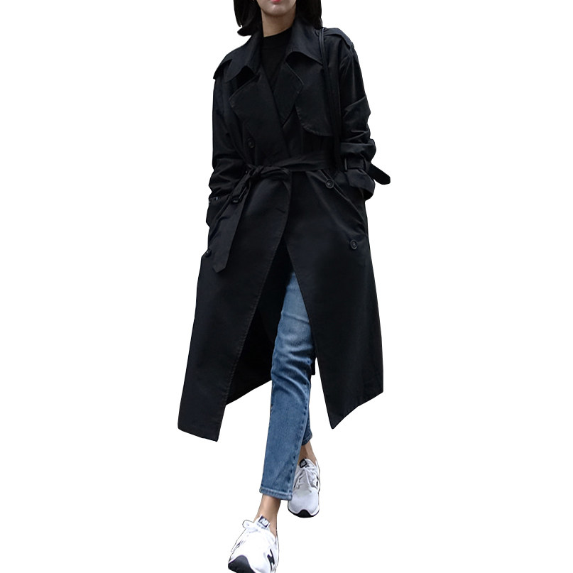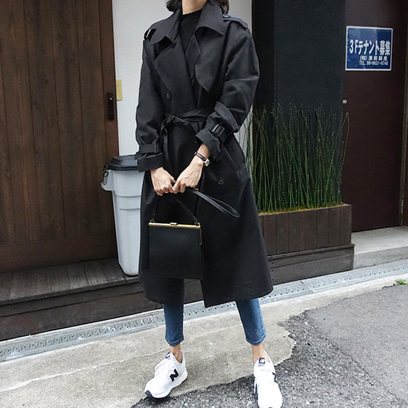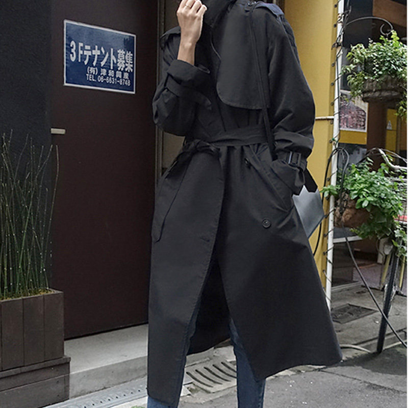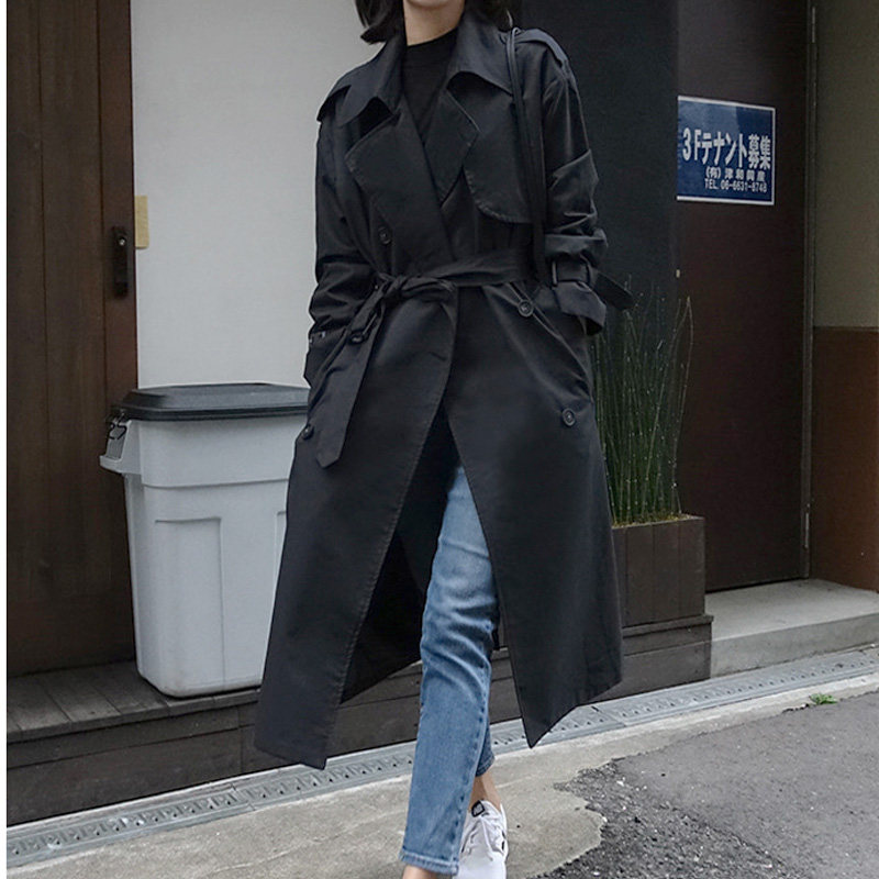2022 Spring and autumn new Korean version with long version of loose black windsuit woman belt big coat and large size coat