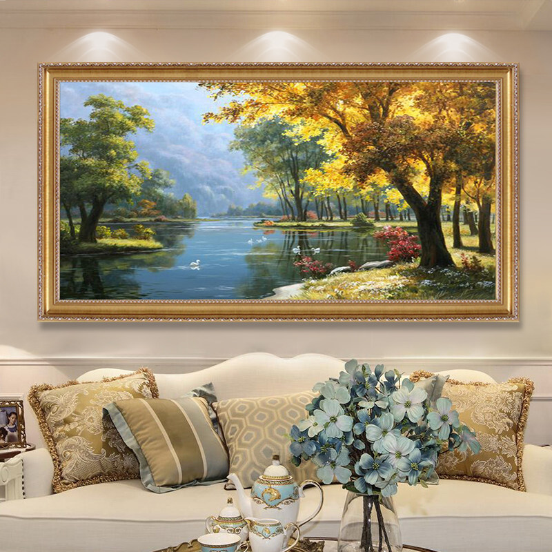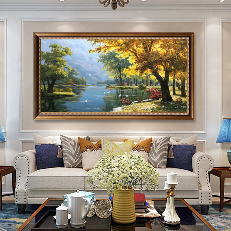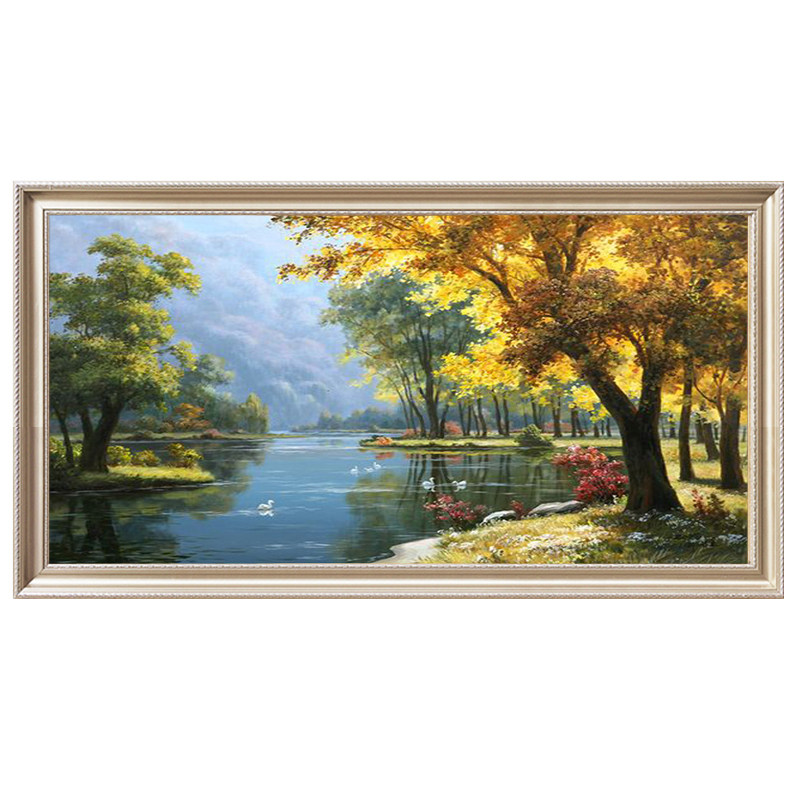 Hand-painted oil painting living room European-style landscape decorative painting American-style Swan Lake landscape hanging painting fortune tree giant mountain mural