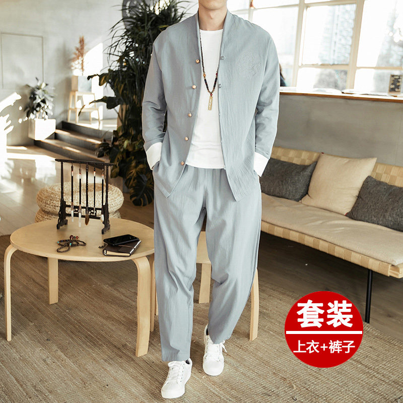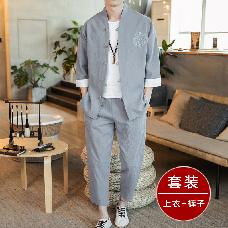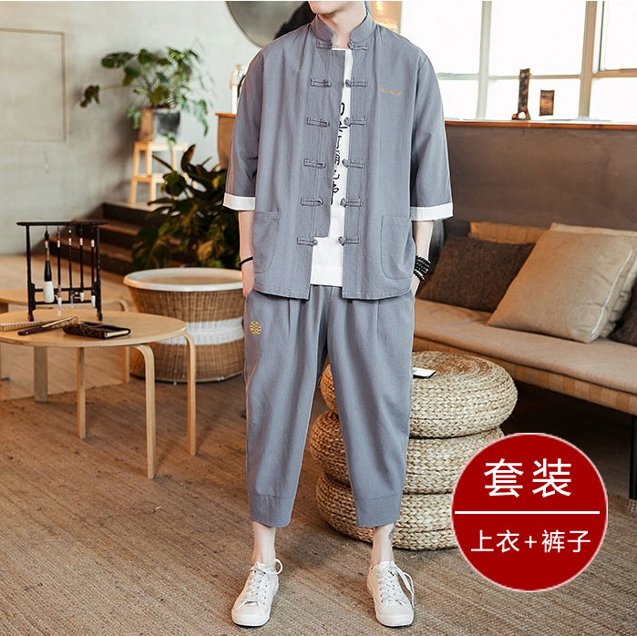 Summer Chinese style men's linen short sleeve suit ancient Chinese coat cotton linen retro style Han clothing youth Tang suit tide