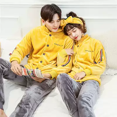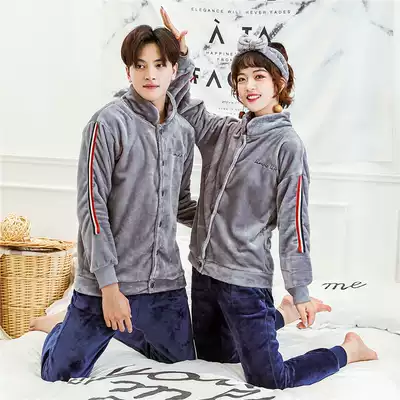 Flannel pajamas for men and women autumn and winter coral velvet thickened warm feet close up stand collar couple home service suit