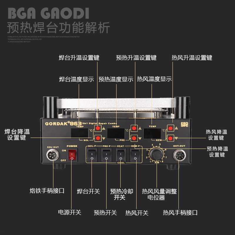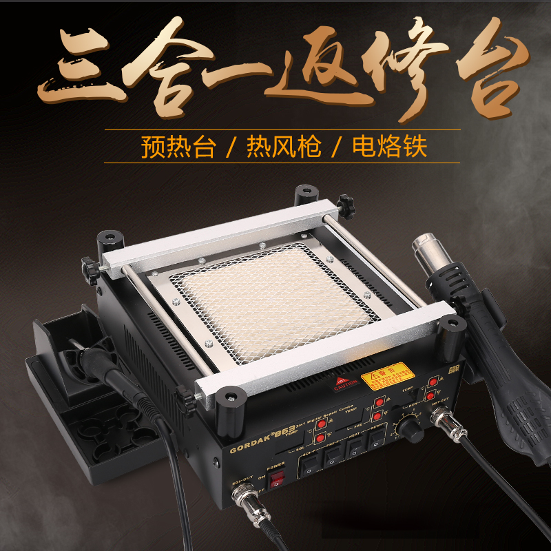 Gaudi 863 digital display heating table Three-in-one preheating table BGA rework table Hot air gun desoldering table Anti-static soldering iron