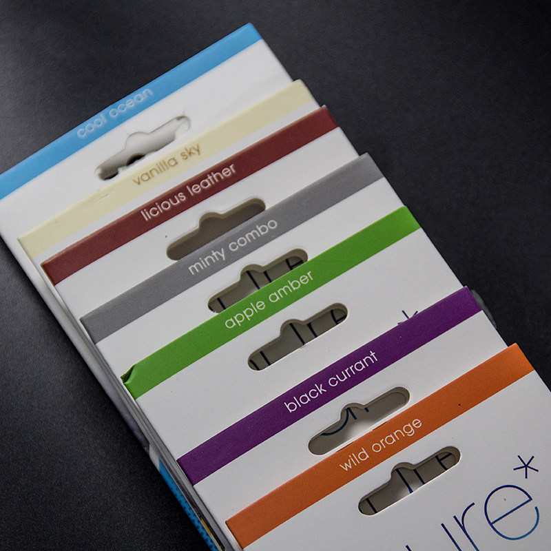 Cool ocean (blue) field orange fragrance (orange) amber apple (green) cool mint (grey) unique leather (brown) vanilla sky (yellow) aged black vinegar (purple)
