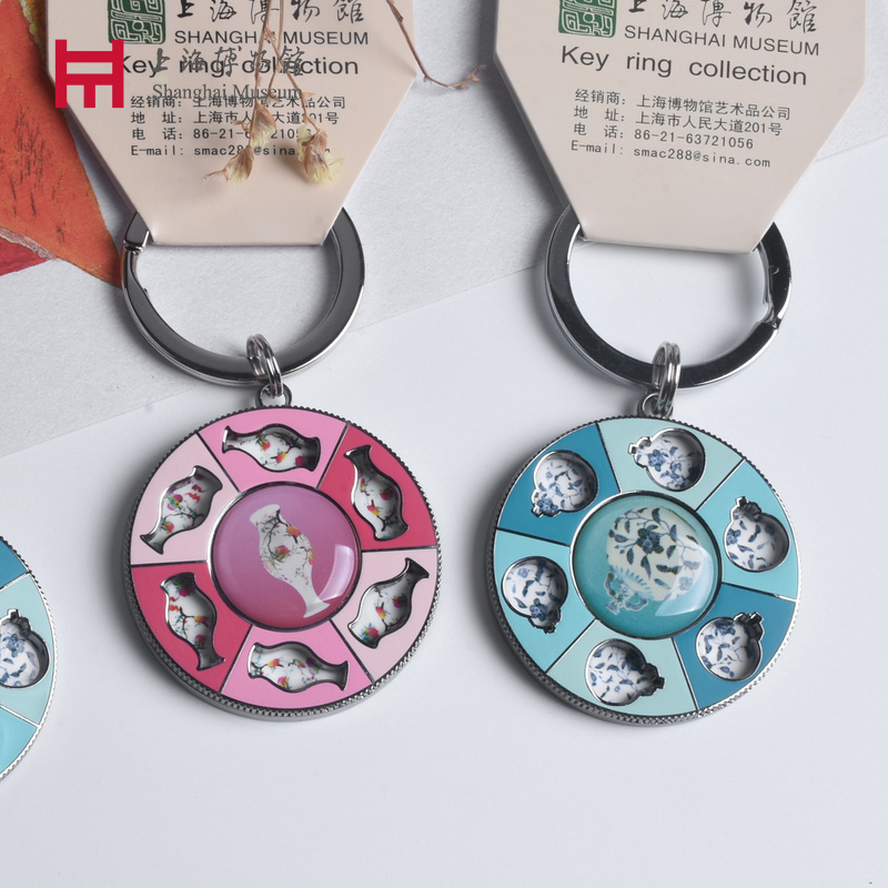 Shanghai Museum Blue and white camellia pattern flat pot keychain pendant Rotating heart bottle creative rotatable key ring ring