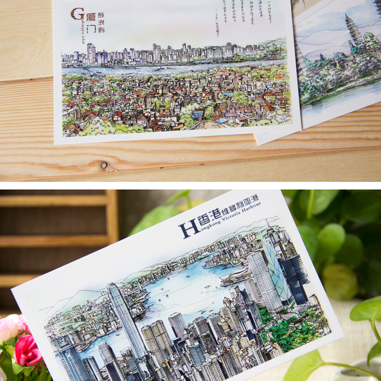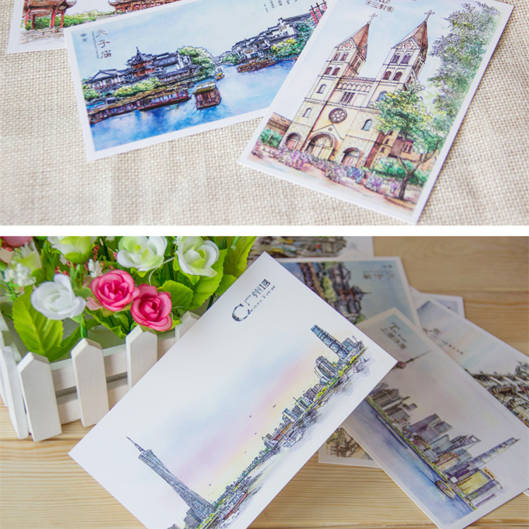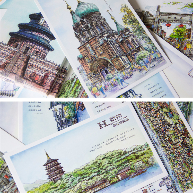 16 Hand-painted Beautiful China Postcard Creative Tourism Landscape Cards in Beijing Nanjing, Chongqing, Hangzhou, China