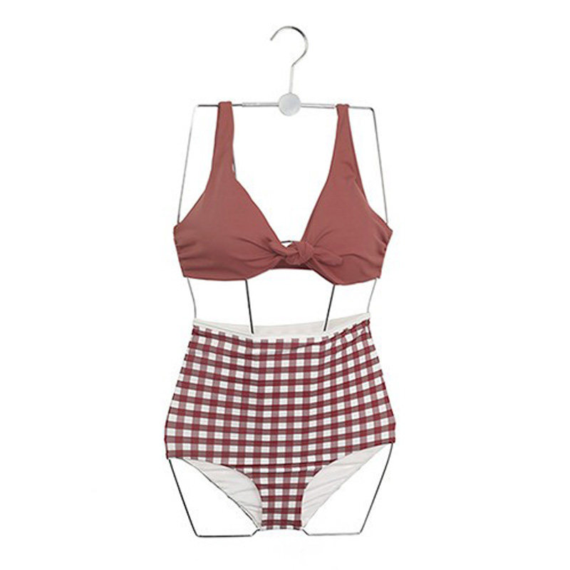 Net red small square grid bean sand color up and down different color high waist cover two style bikini