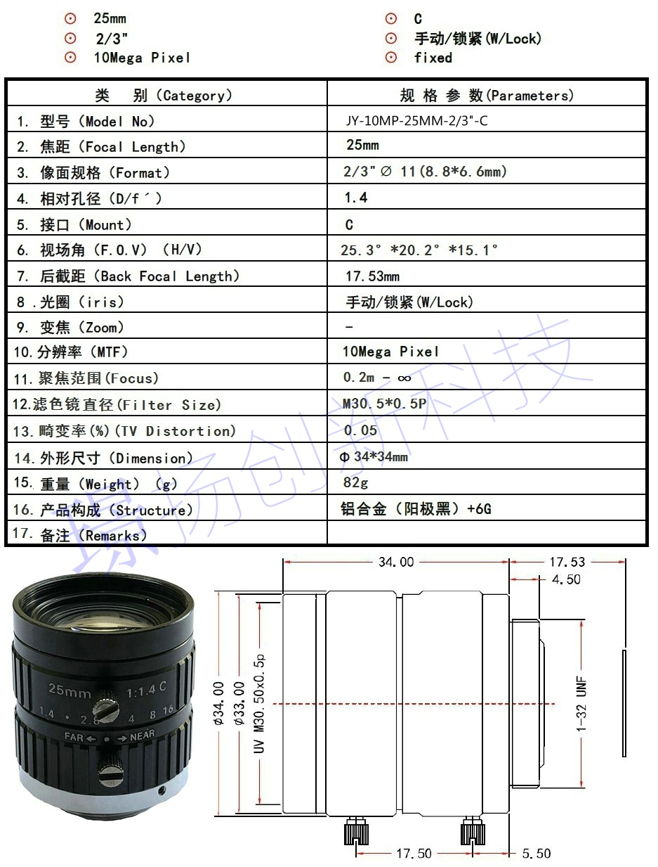10 million high-definition industrial camera visual inspection intelligent transportation C-mount lens 25mm 2 3" large target surface