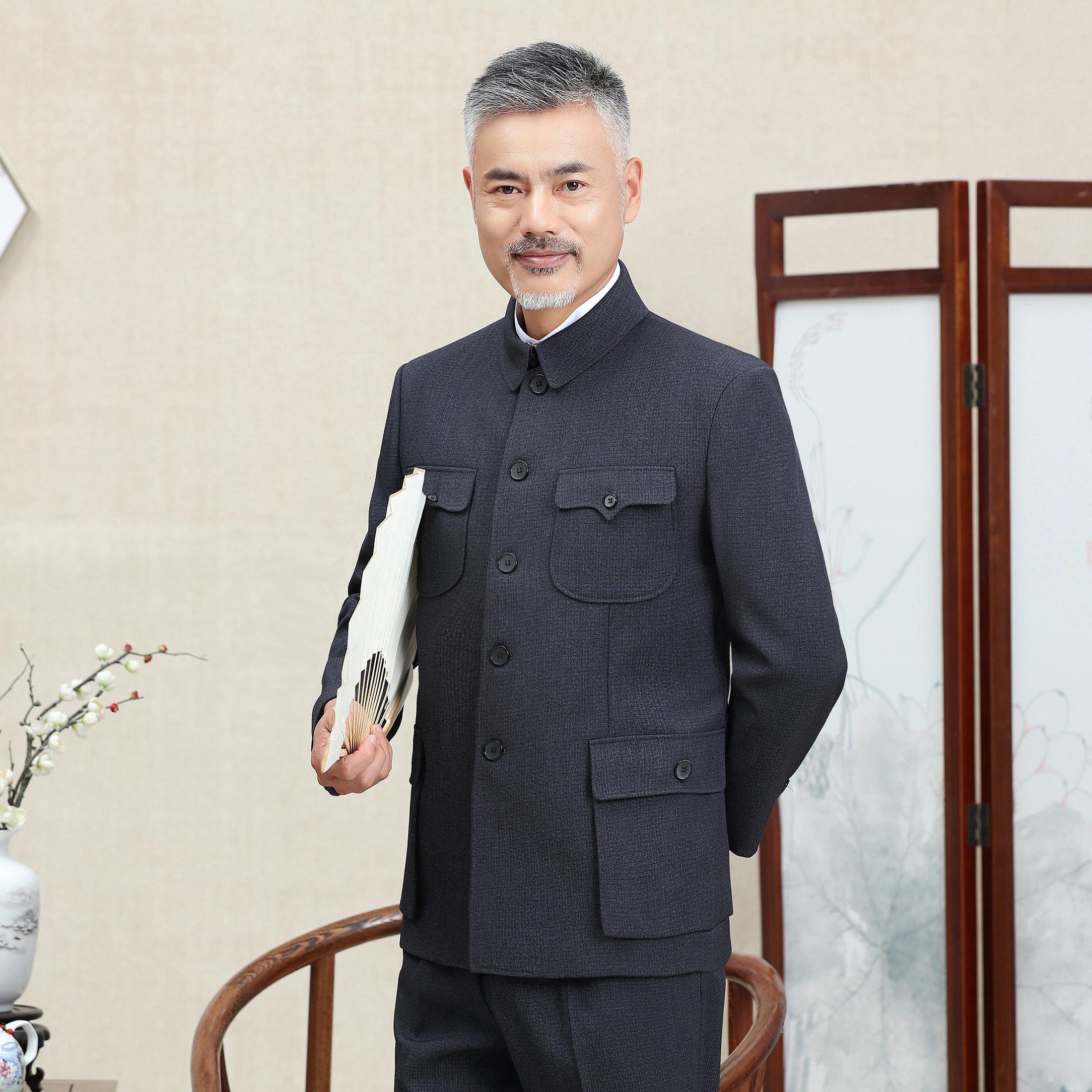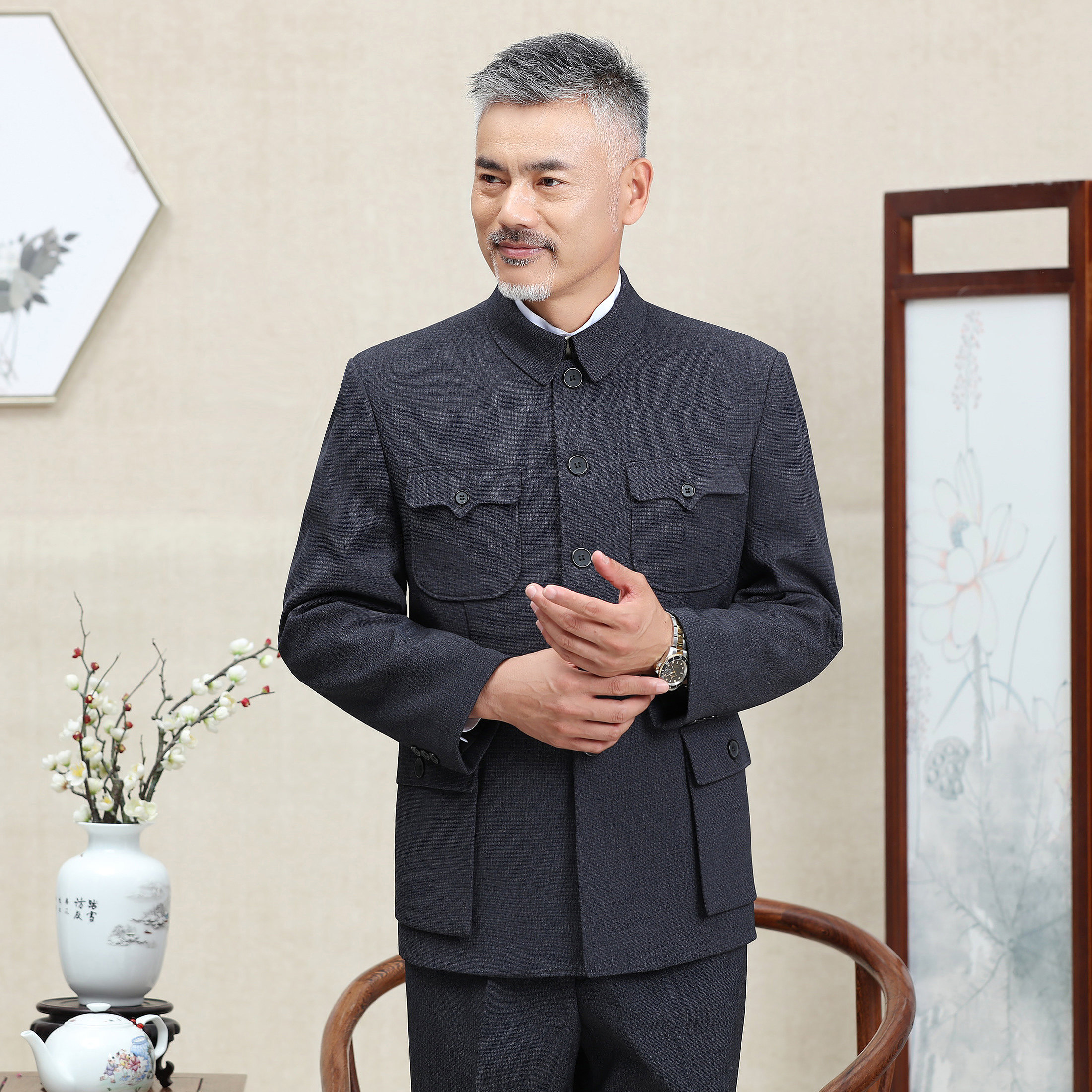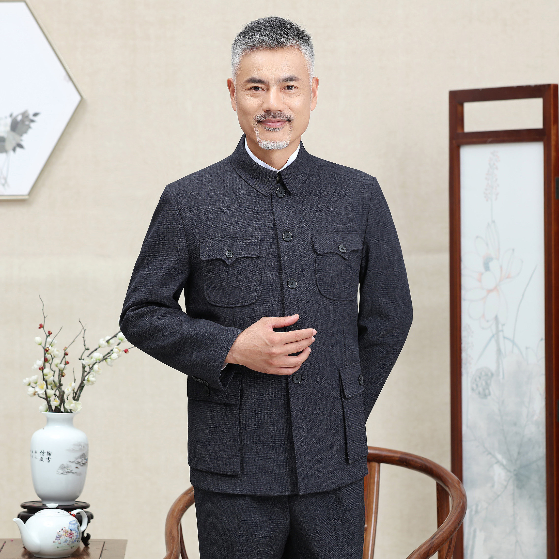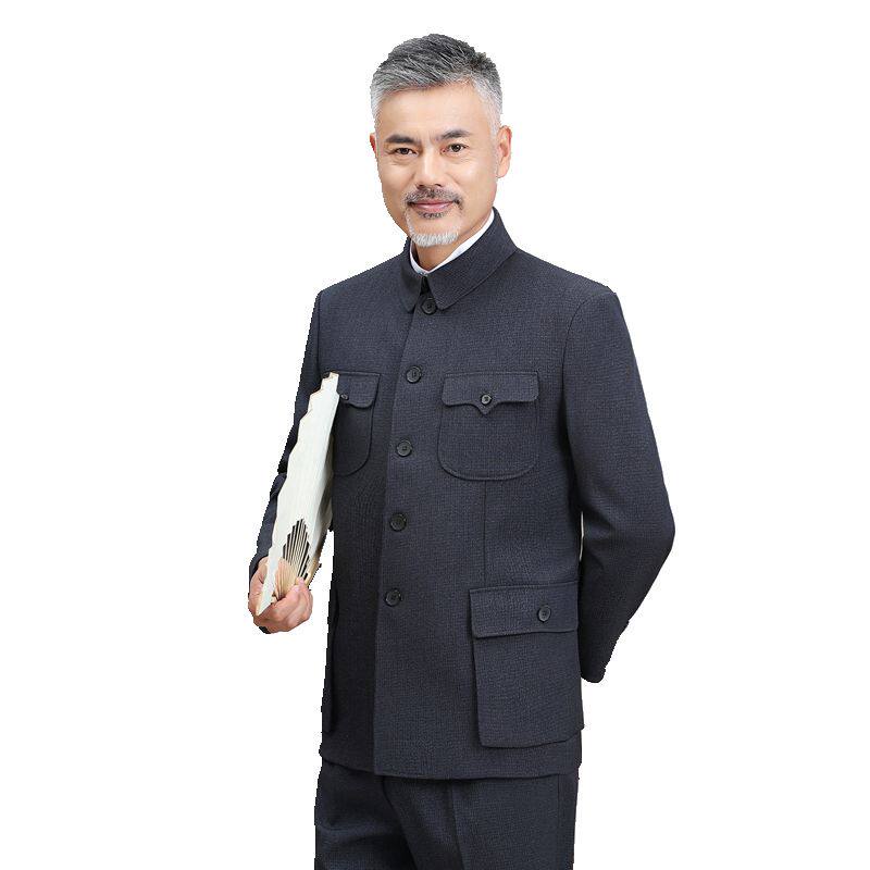 Zhongshan Clothing Men's Middle Aged Suit Autumn Winter Sun Zhongshan Suit Men's Cotton Plus Suede Thickened Seniors Clothes Men's Jacket Dads