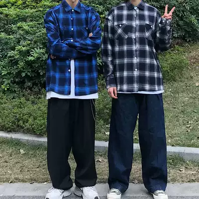 KTDA 19F W Tide brand new black and white plaid bf style couple long sleeve men and women loose plaid shirt