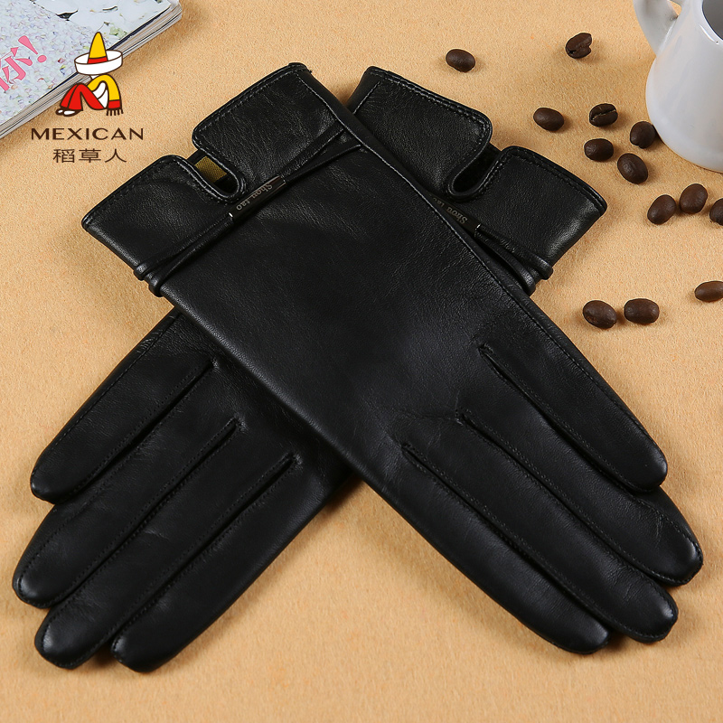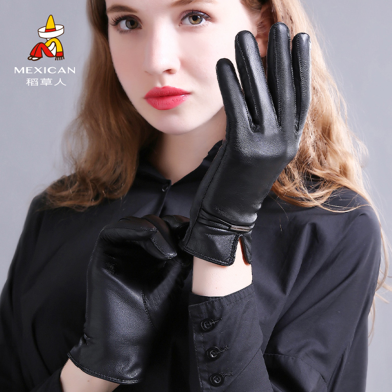Rice straw man genuine leather gloves ladies warm and cold winter driving locomotive windproof and waterproof outdoor touch screen sheepskin