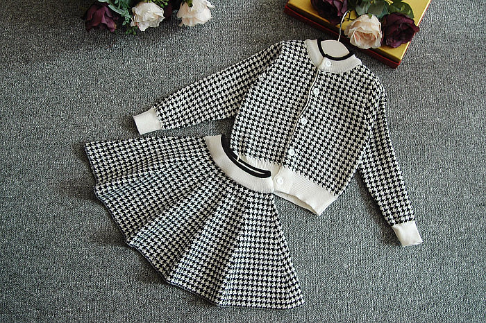 Girls houndstooth knitted suit 2021 spring and autumn new Korean version children's Western style sweater cardigan short skirt two-piece set