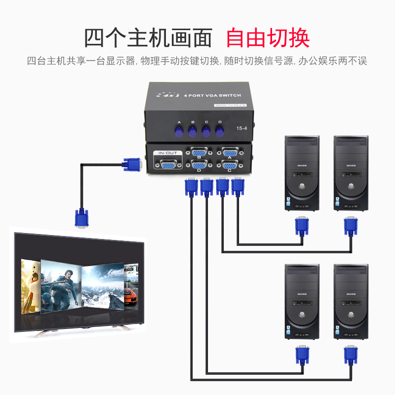 Haitianniu vga switcher 4 in 1 out computer monitor video converter cable four port desktop host monitor HD signal screen four in one out share one monitor