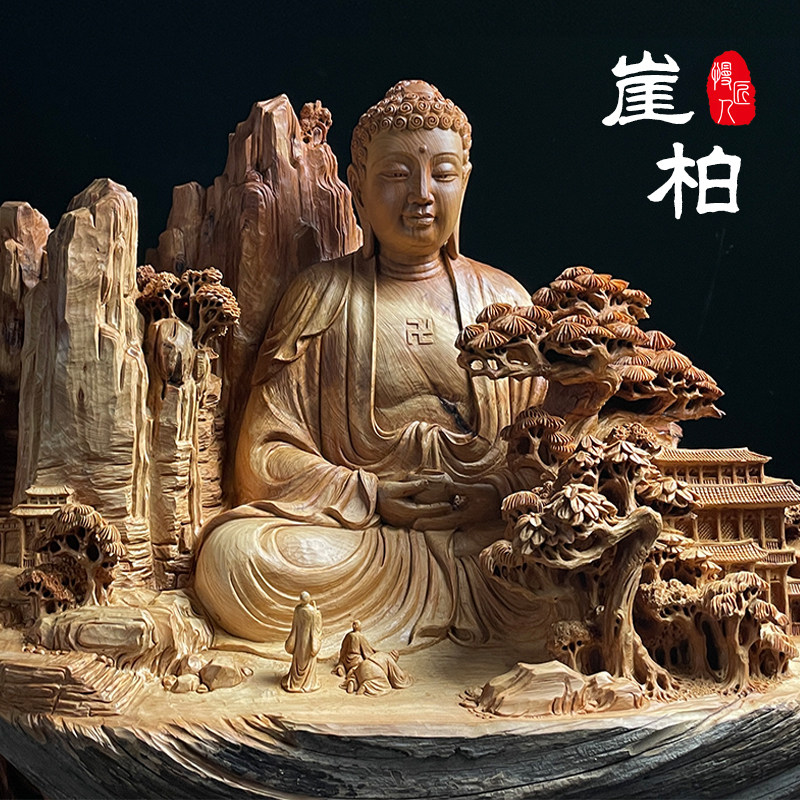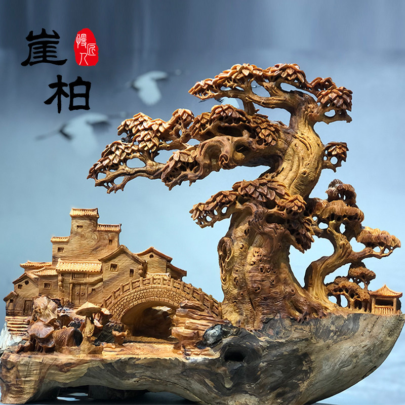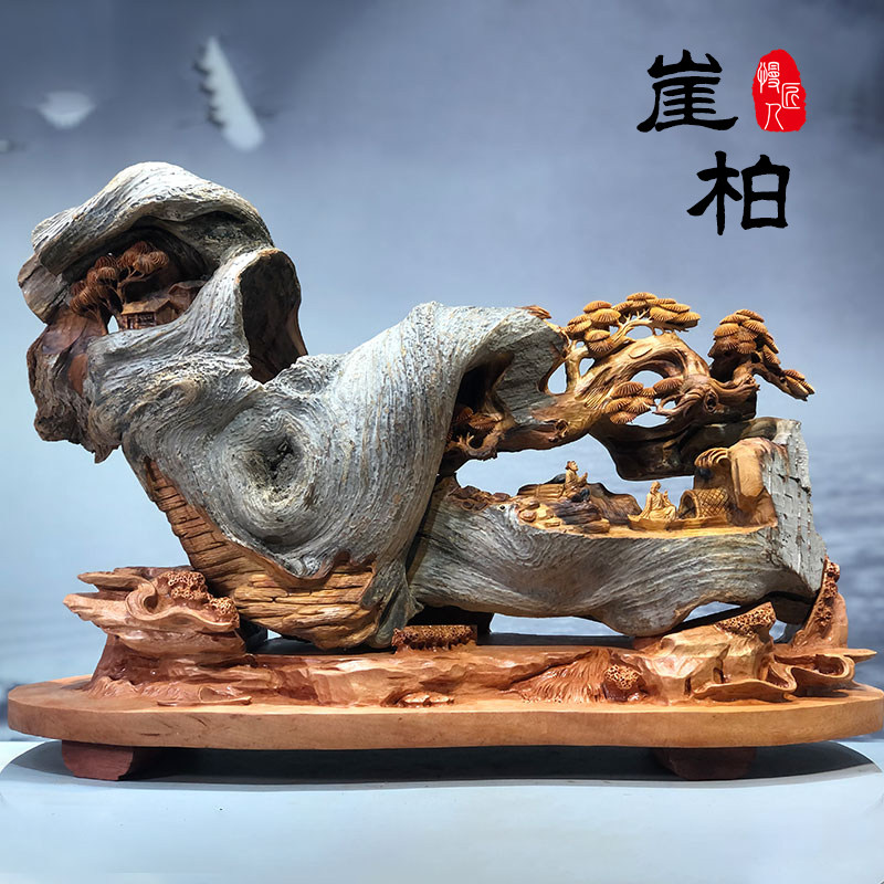 Slow craftsman root carving straight sowing room Too much of a cliff, aging old material pendulum piece by hand engraving root sculpted landscape flower bird figure-Taobao