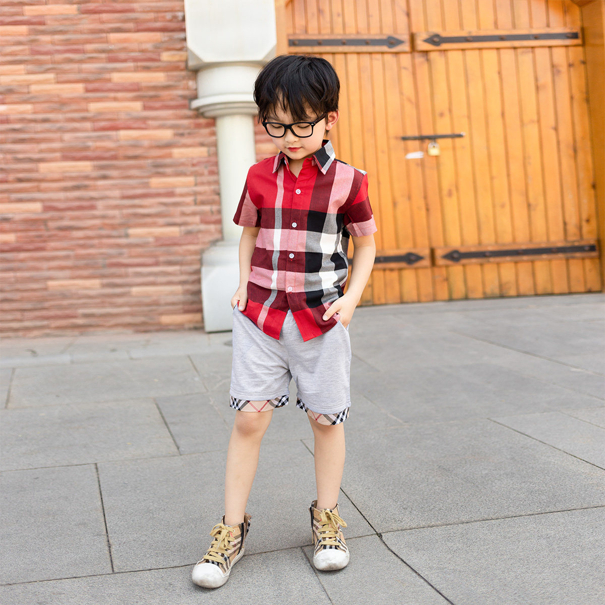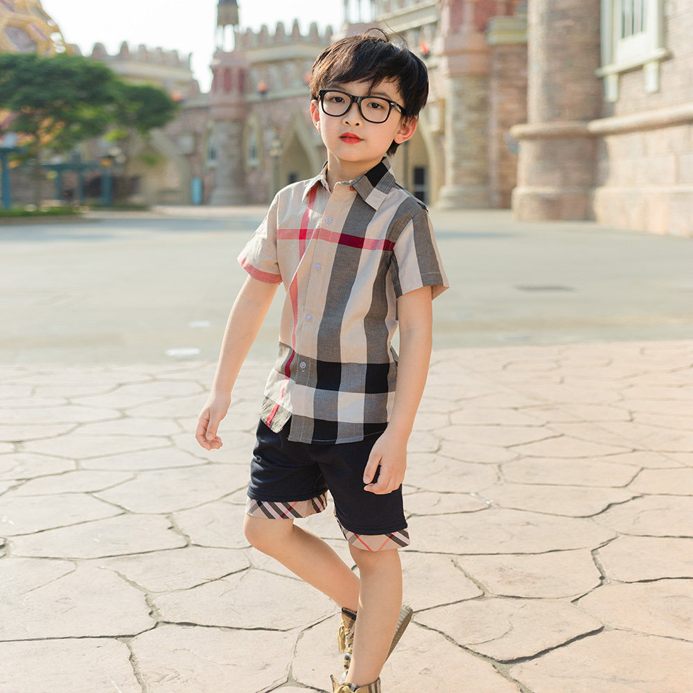 Children's clothing children's cotton plaid shirt thin boy British plaid shirt summer baby short-sleeved top Korean dress