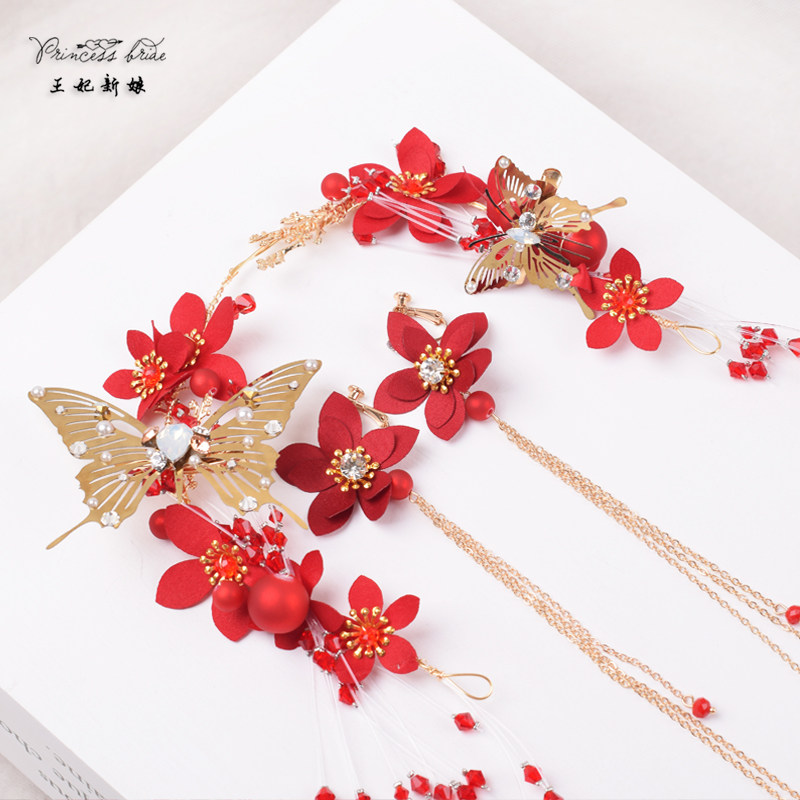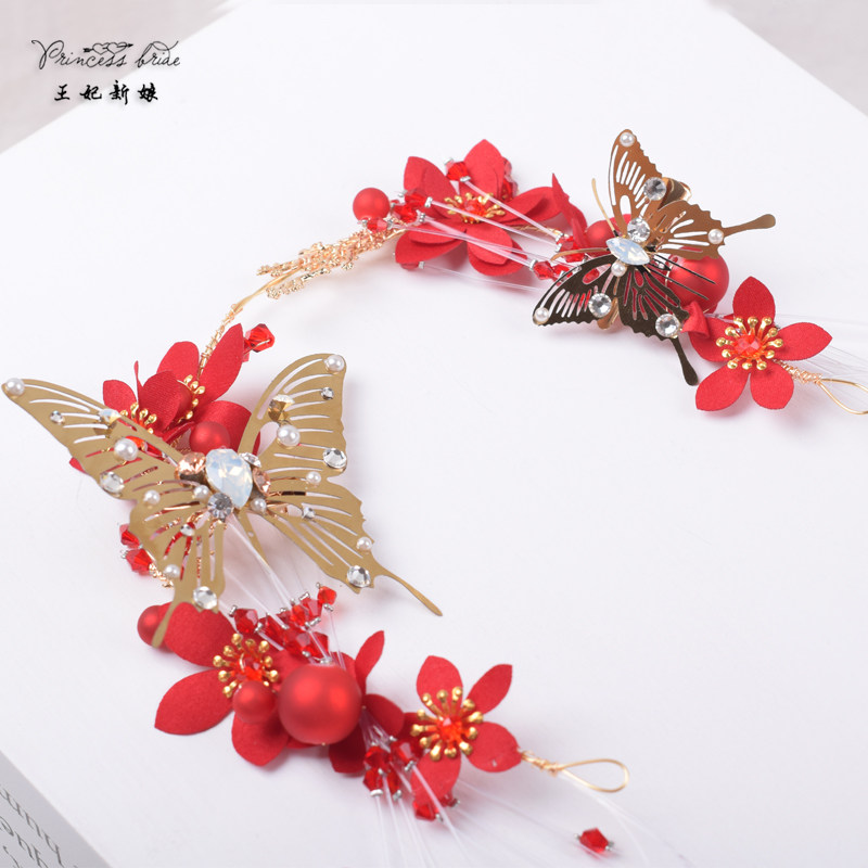 Princess Bride Retro Red Hair Accessories Set Golden Butterfly Tiara Toast Dress Wedding Dress Party Jewelry