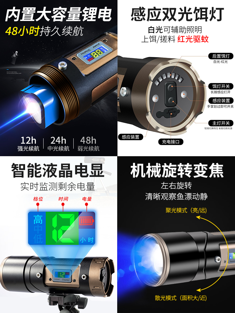 Four-color light source induction electrocontrol zoom + fishing box bracket Send waterproof bag