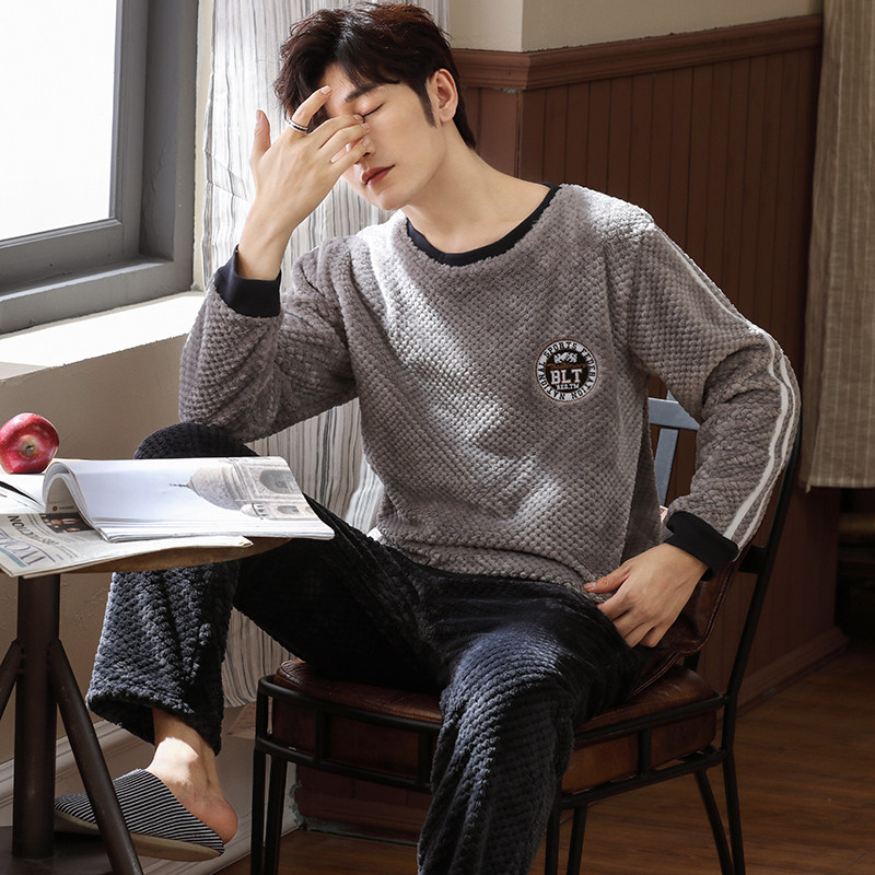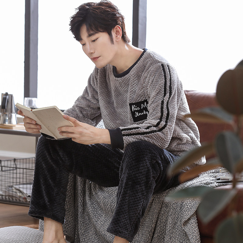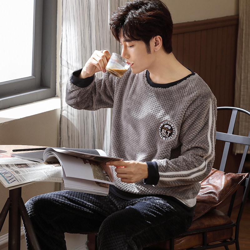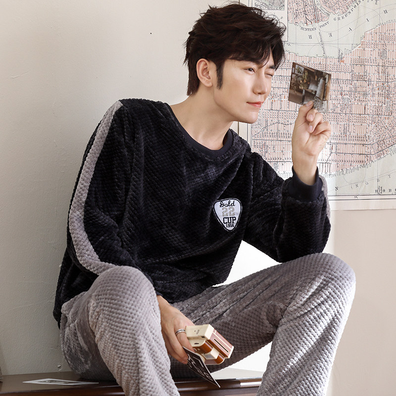Pajamas men's winter thickening and velvet coral velvet autumn and winter men's flannel youth men's home wear suit pullover