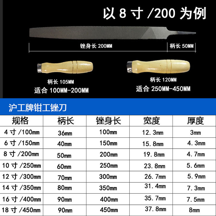6-inch-150mm coarse-toothed flat files (2 pieces) 6-inch-150mm medium-toothed flat files (2 pieces) 6-inch-150mm fine-toothed flat files (2 pieces) 8-inch-200mm coarse-toothed flat files