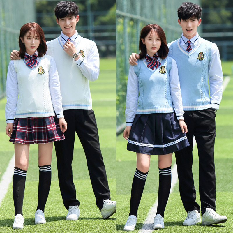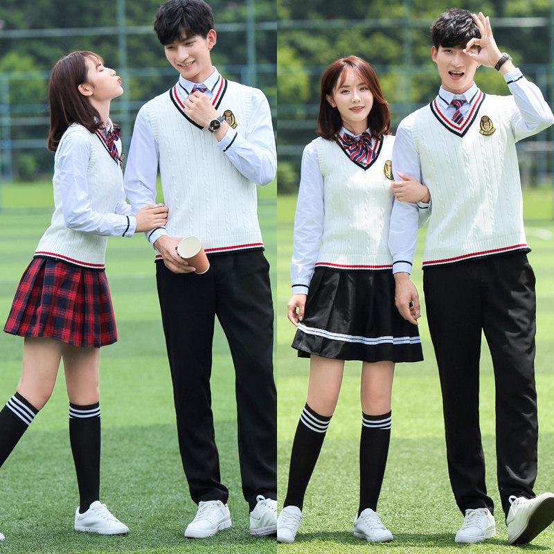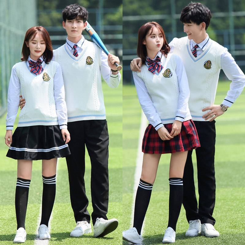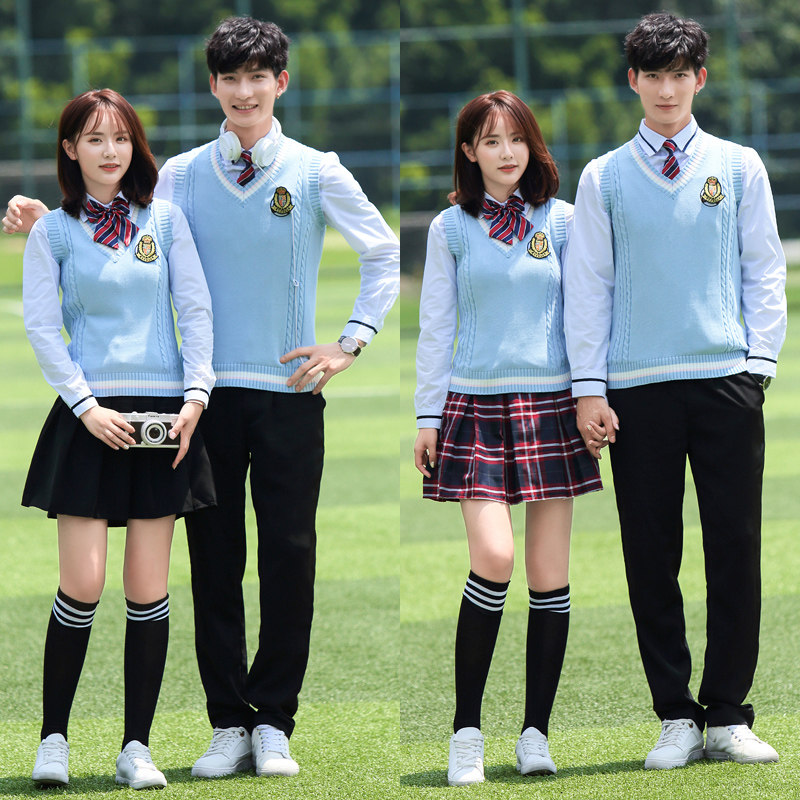 Male White Blue Side Vest Shirt Black Long Pants Woman White Blue Side Vest Shirt Black Navy Skirt Pants Woman White Blue Side Vest Shirt New Red Plaid Skirt Woman White Blue Side Vest Shirt Red Black Grey Skirt