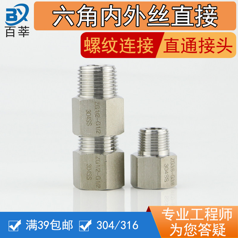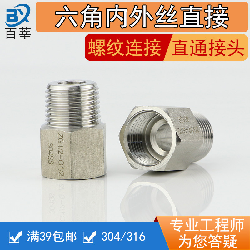 304 stainless steel hexagon internal and external wire direct internal and external thread straight-through joint 4 points 6 points DN15 20