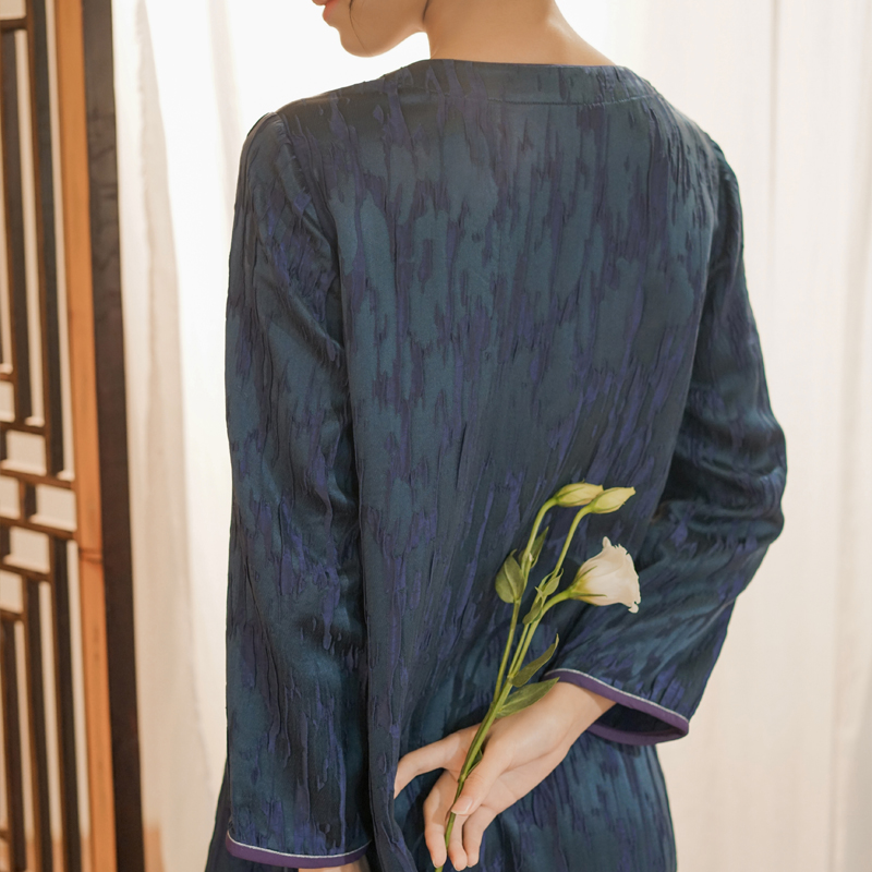 Zhu's original (Haiyan) silk brocade jacquard slant flap long sleeve loose foreign dress big gown irregular V-collar skirt