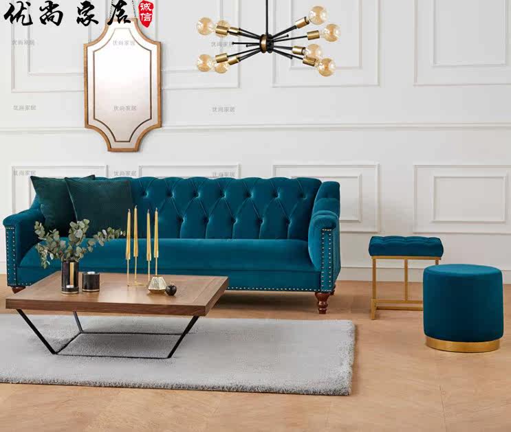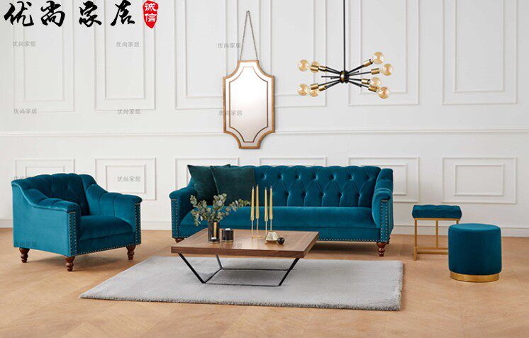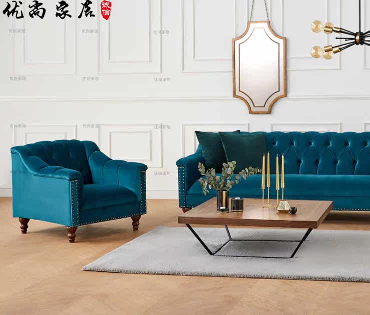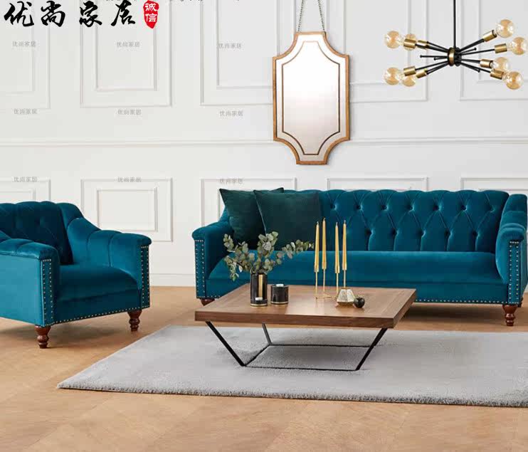 American-style fabric small apartment single, double, and three-person combination hair Nordic club hotel model room blue flannel sofa