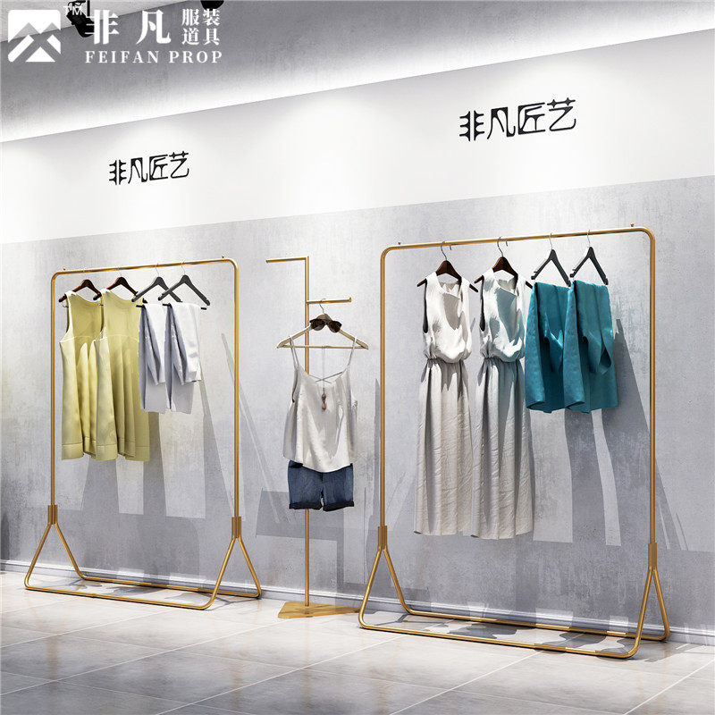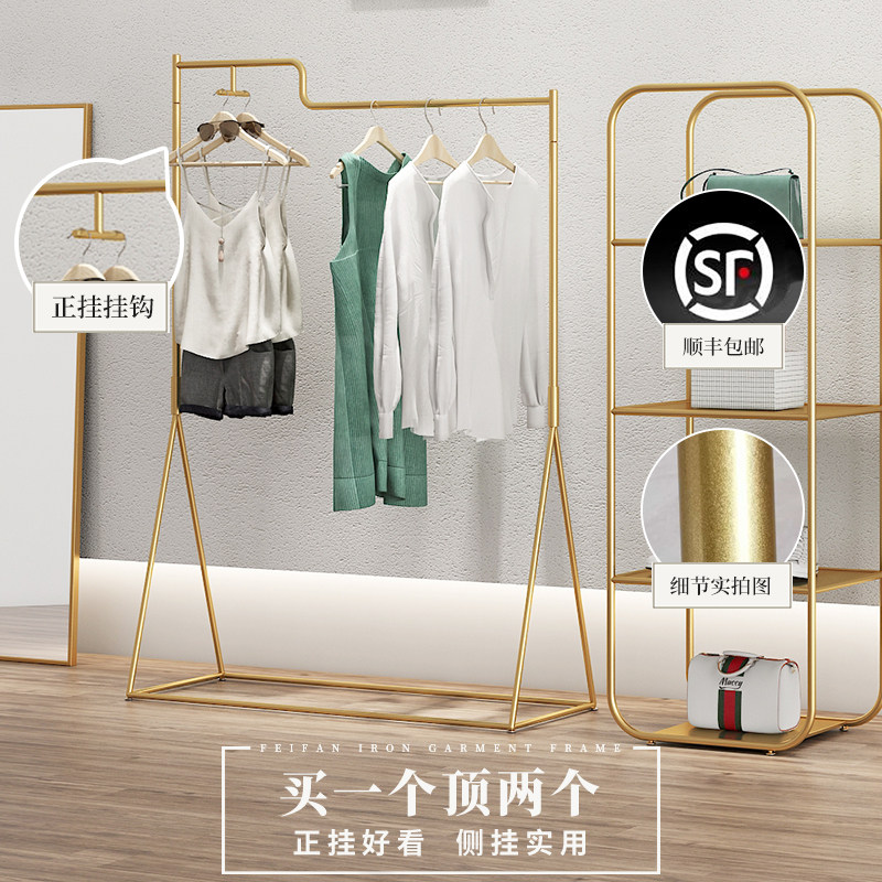 Golden clothing store display stand Floor-to-ceiling combination of simple wrought iron display side hanging women's store hanging clothes rack