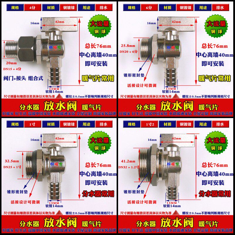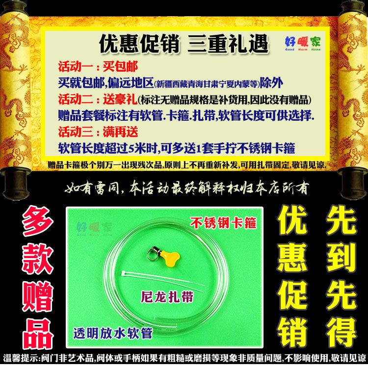 4 min discharge valve No Gifts 6 min discharge valve (Heating tables commonly used) 1 inch water discharge valve (Water divider commonly used) No Gift 1 inch 2 water discharge valve No Gifts 6 minutes automatic exhaust valve delivered