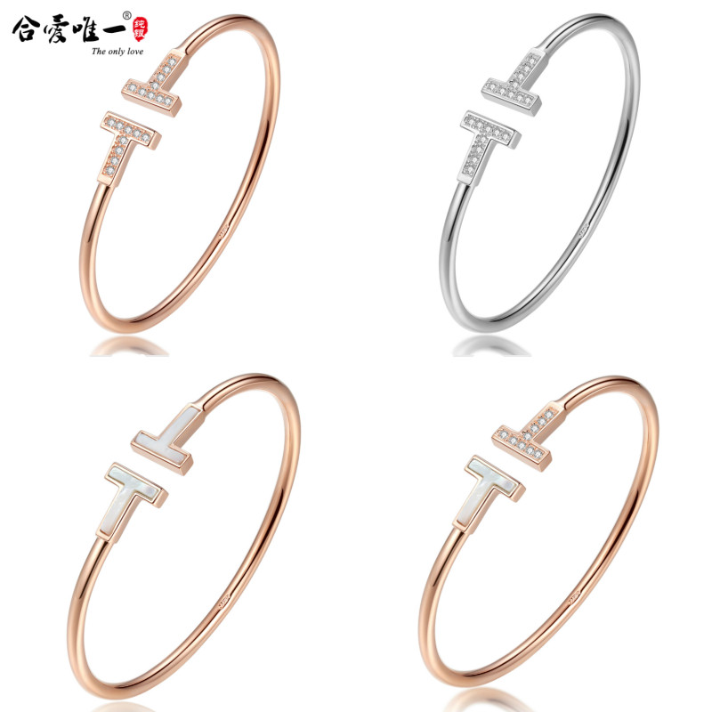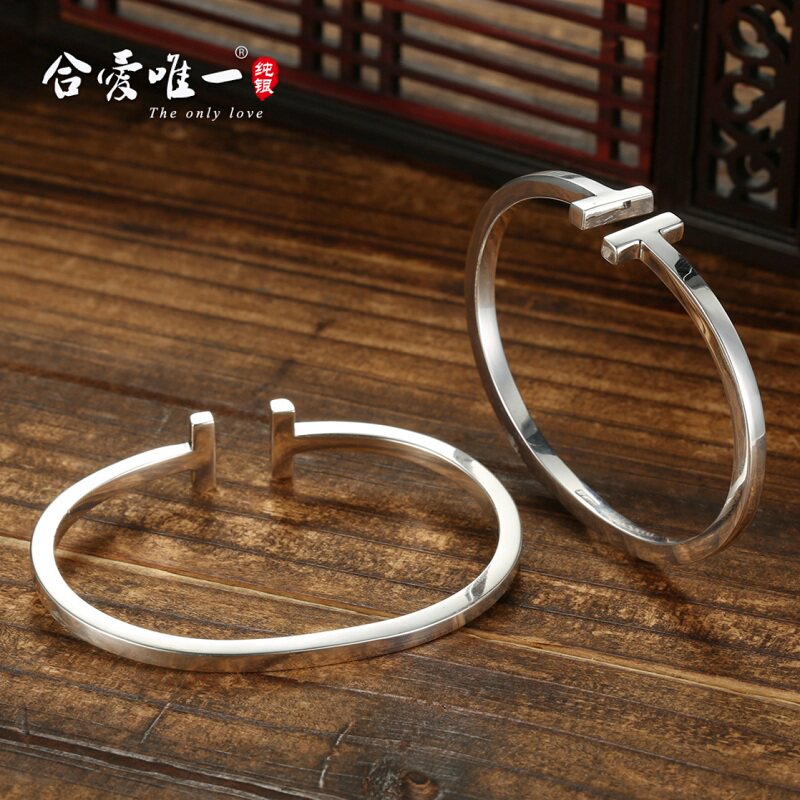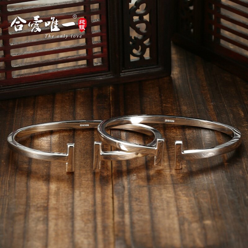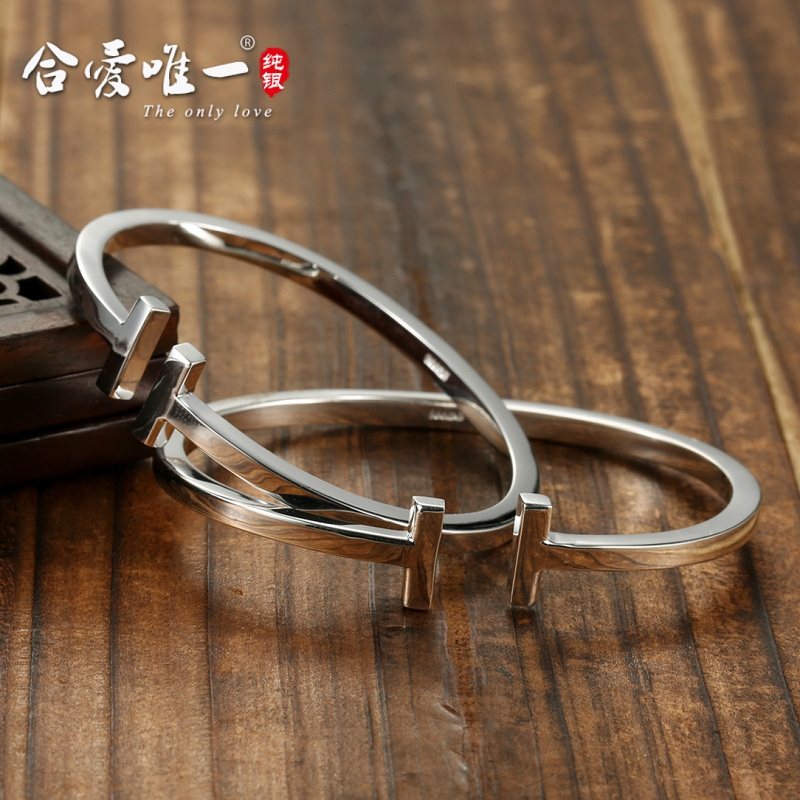 (female section) plated rose gold deposit insert-white stone bay double T bracelet (13 gr foot silver 990) (male section) pure silver 9999 double T couple bracelet round (33 gr round inner diameter 61m