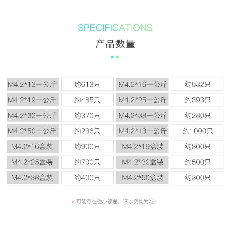 M4 2*13 A kilogram(about 613 pcs) M4 2*16 A kilogram(about 532 pcs) M4 2*19 A kilogram(about 512 pcs) M4 2*25 A kilogram