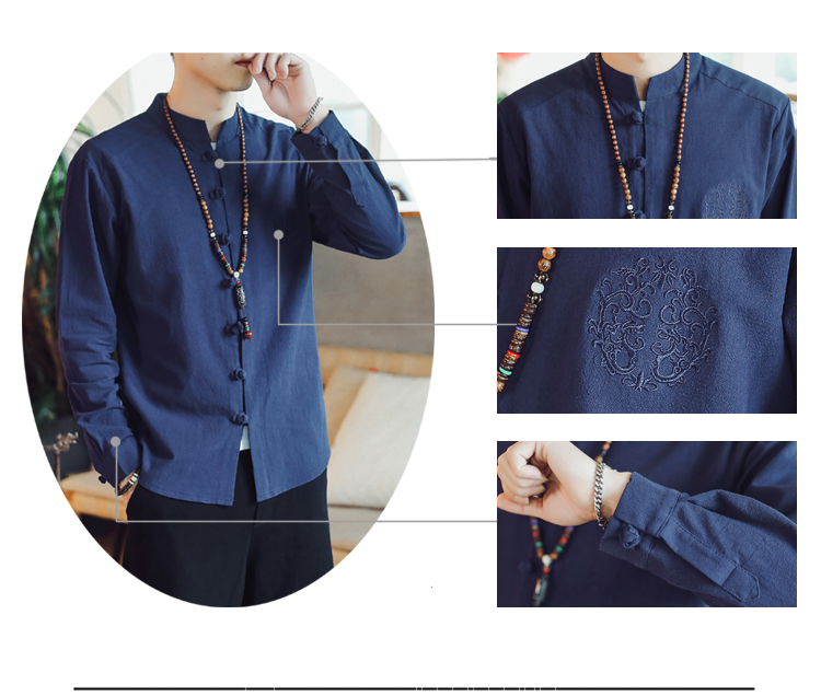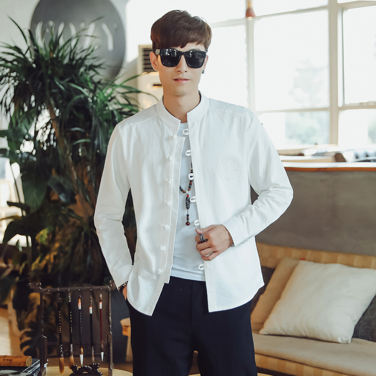 Chinese style men's long-sleeved embroidered stand-up collar linen shirt Chinese top Vintage Tang clothing plate buckle cotton and linen shirt