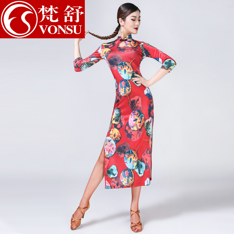 Fanshu flower Latin dance costume long version new adult female dress cheongsam autumn and winter annual performance practice suit
