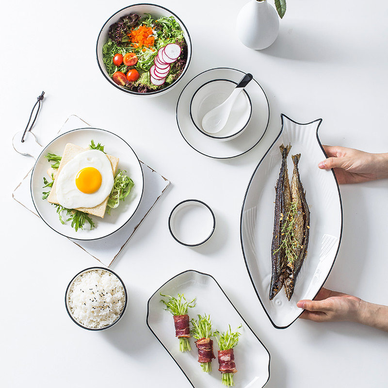 Nordic simple black line ceramic tableware plate plate Household creative plate Western plate Dinner bowl soup plate
