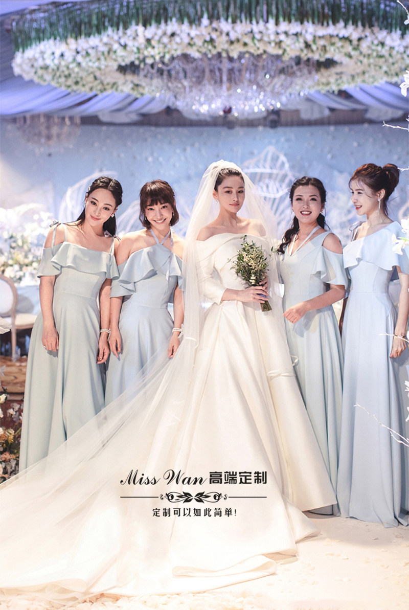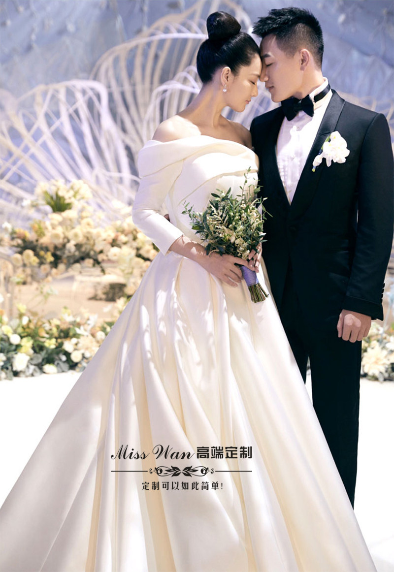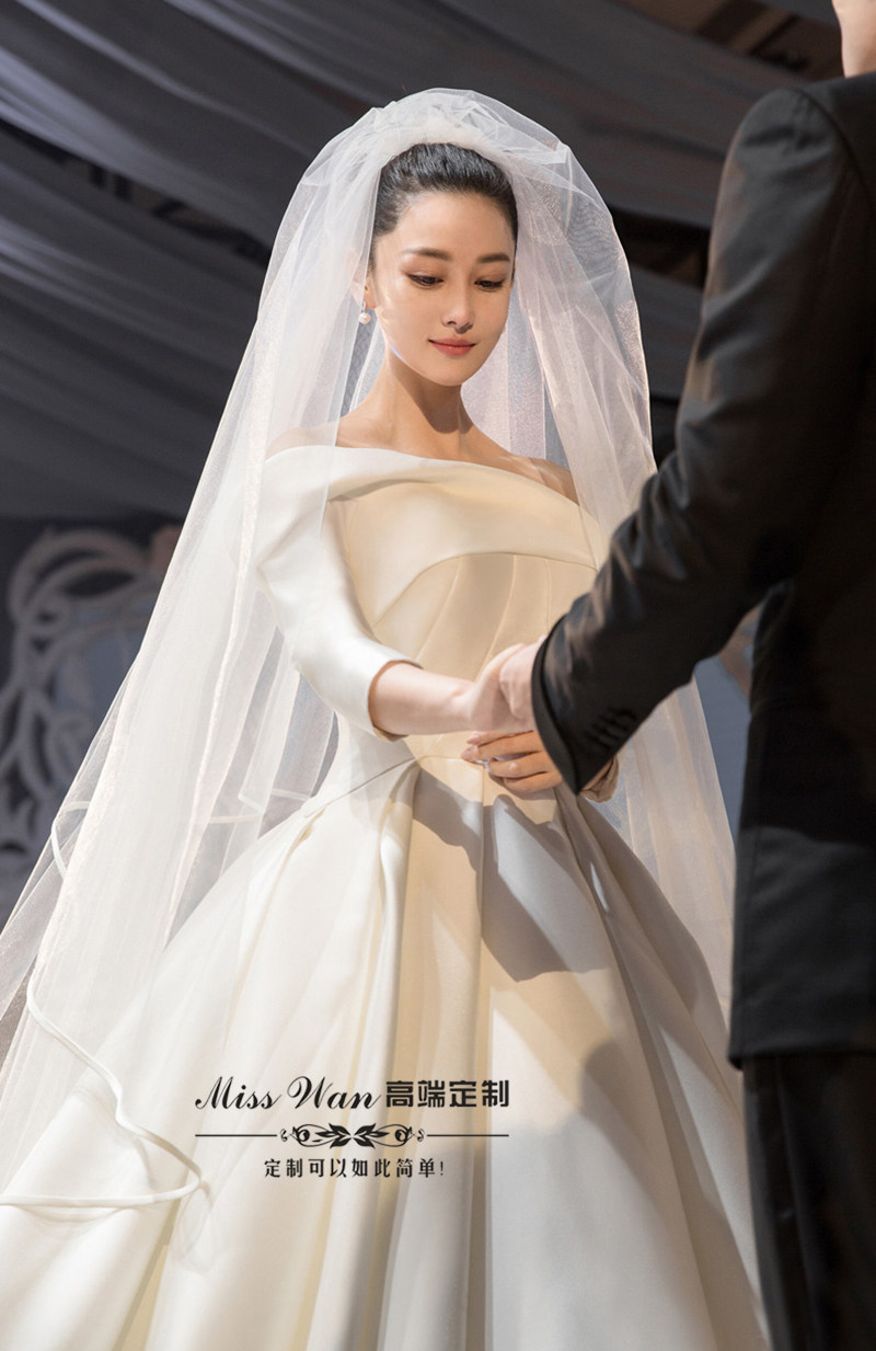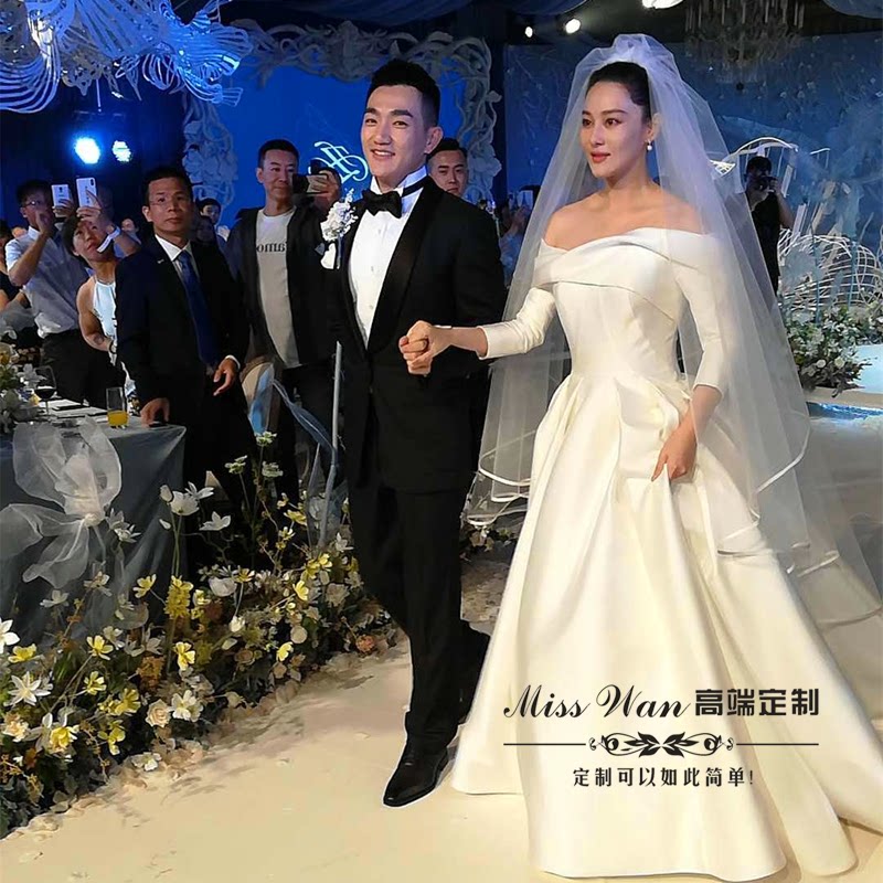 2022 new one-shoulder satin long tailed Zhang Xinyu the same forest style dream Hepburn style mid-sleeve wedding dress