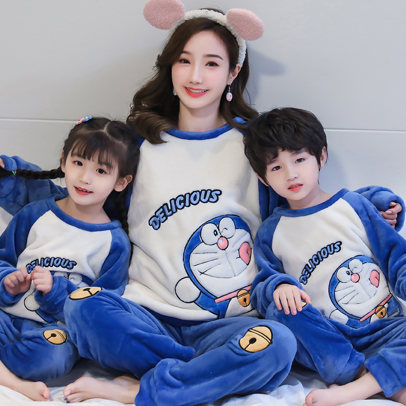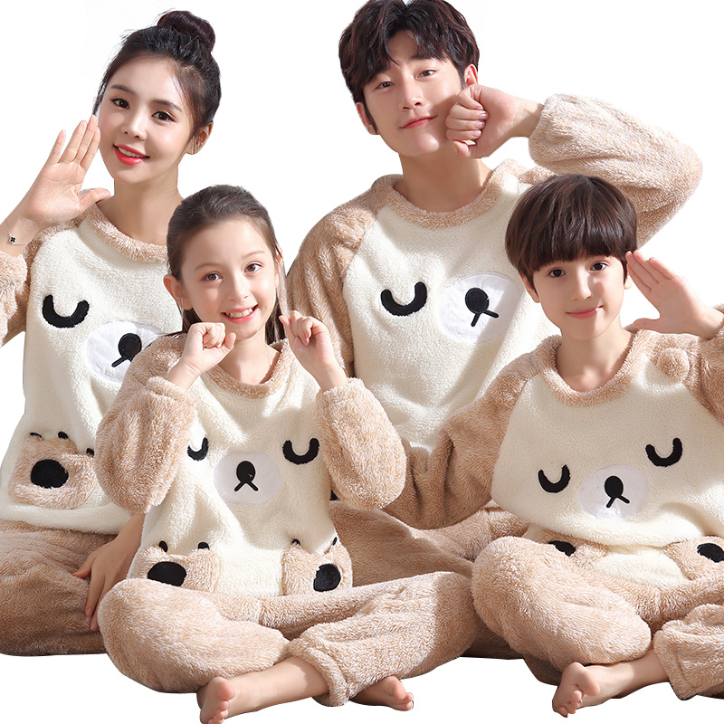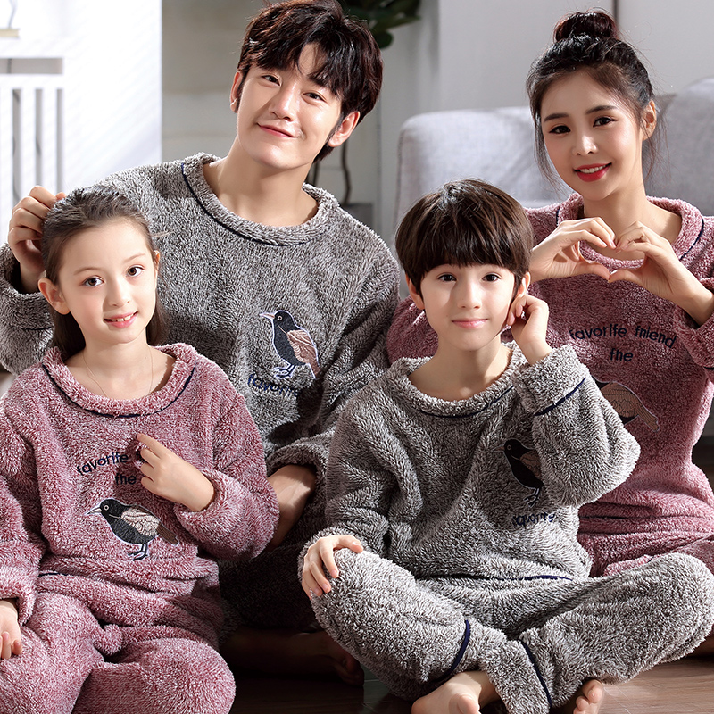 Parent-child sleepwear family of three female corals Coral Suede Winter Thickened Flannel Boy Children's Home Suit Suit