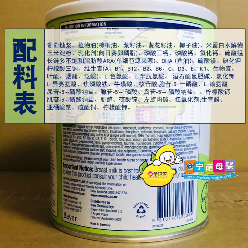Ning Meng Australia Bayer Bayer Novalac Baoyile Rice Protein Fully hydrolyzed Milk Powder 800g