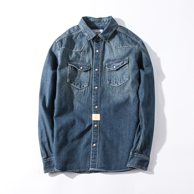 Foreign trade Export UK men's body washed up to make old precious stones buckle denim long sleeve shirt thick solid denim