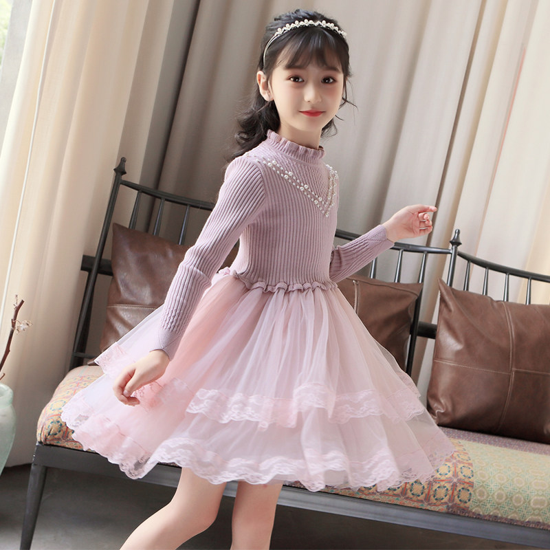 Girls autumn and winter dress 2022 new middle and big boys and girls splicing sweater western style sweater princess skirt
