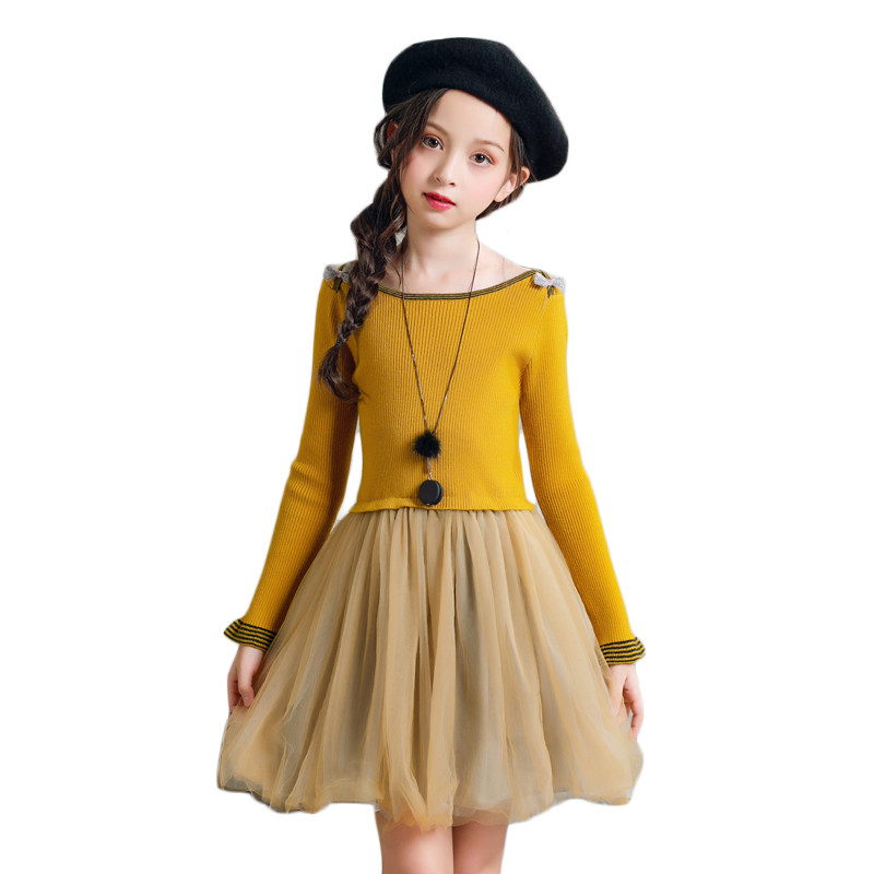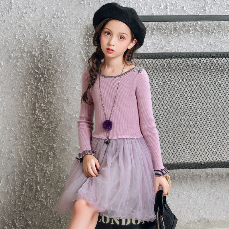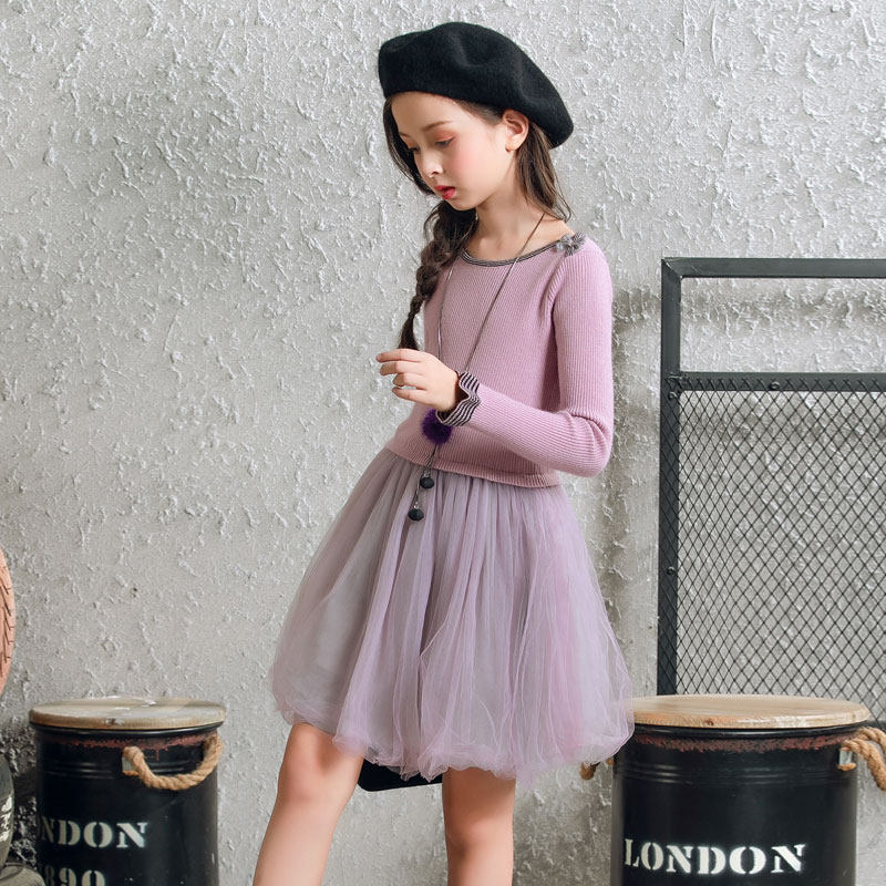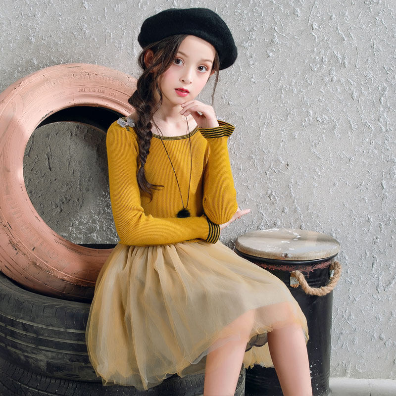 Girls 2022 new autumn and winter dress gauze skirt in the big boy Western style princess skirt with a word collar children's sweater skirt