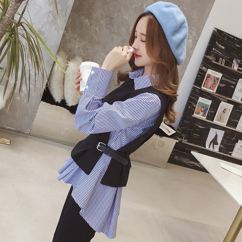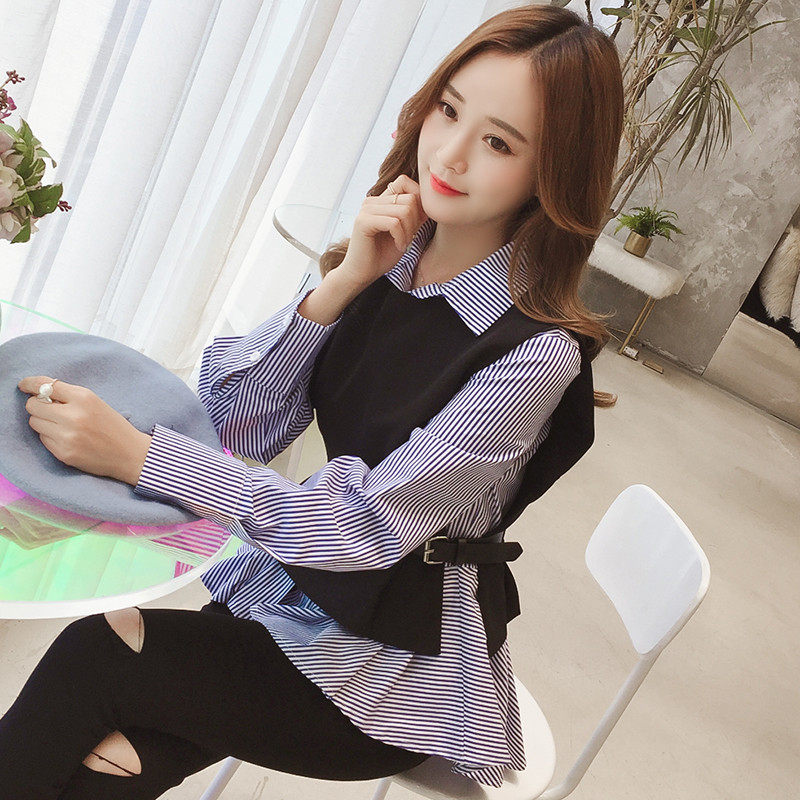 2021 spring and autumn new women's waistcoat with shirt two-piece top striped long-sleeved chic early autumn Han fan shirt