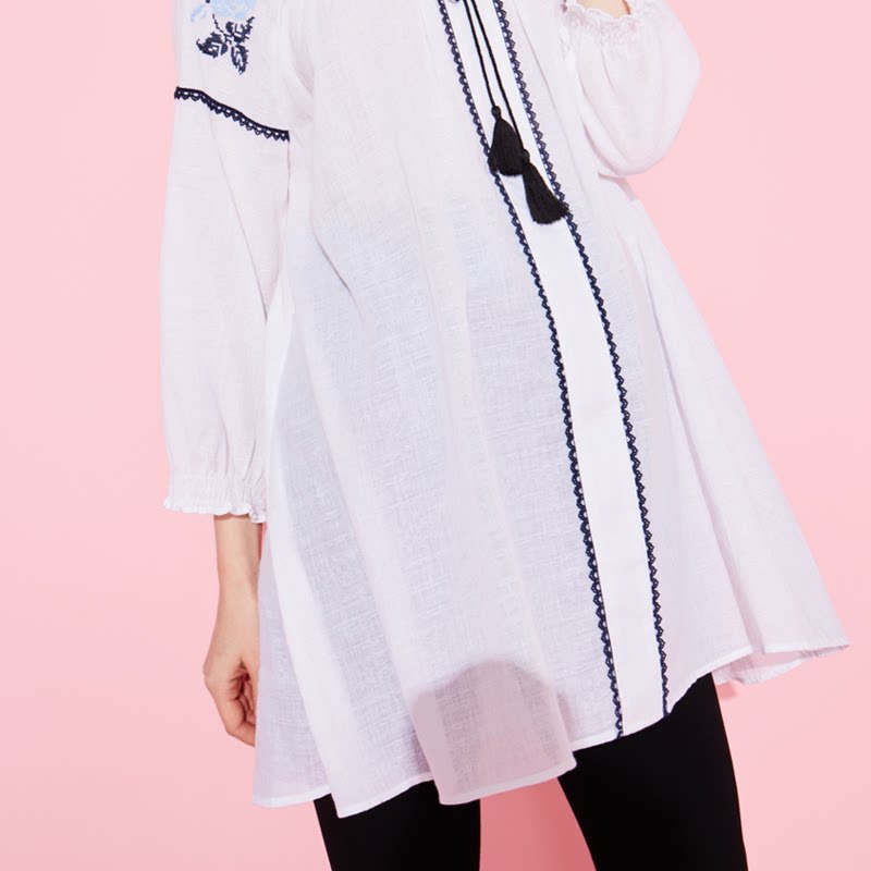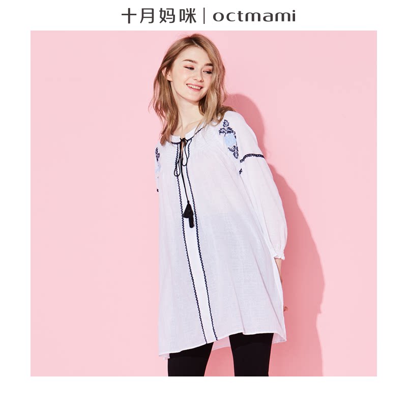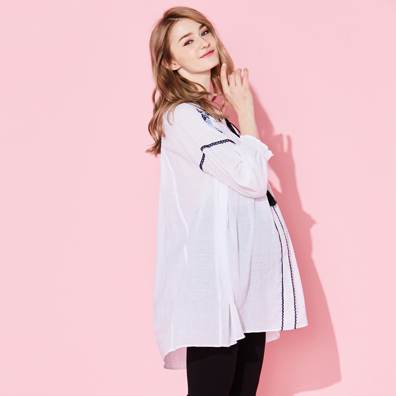 October mommy pregnant spring and summer fashion new cotton embroidered top loose tassel lace-up shirt dress