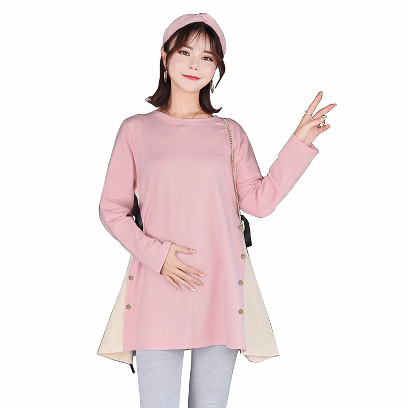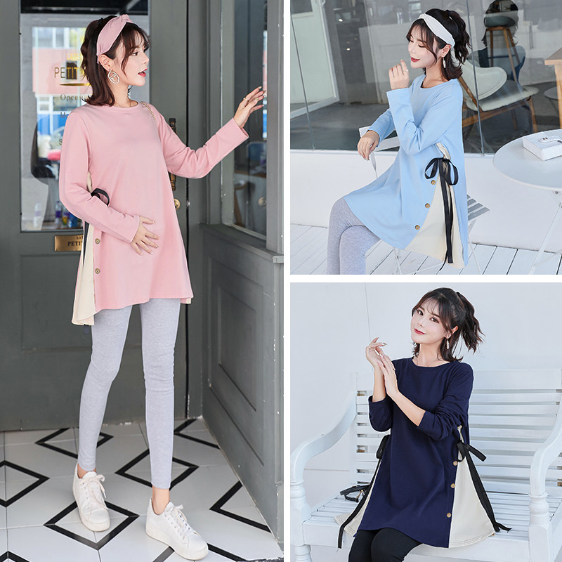 The new fattening large size maternity dress spring and autumn dress pure cotton long sleeves fake two-piece set base top T-shirt 200 pounds