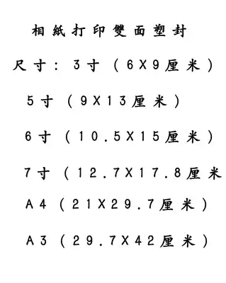 3 inch photographic paper plastic seal 5 inch photographic paper plastic seal 6 inch photographic paper plastic seal 7 inch photographic paper plastic seal A4 photographic paper plastic seal A3 photographic paper plastic seal 5 inch crystal (construction period 10 days) 6 inch crystal (construction period 10 days) 7 inch