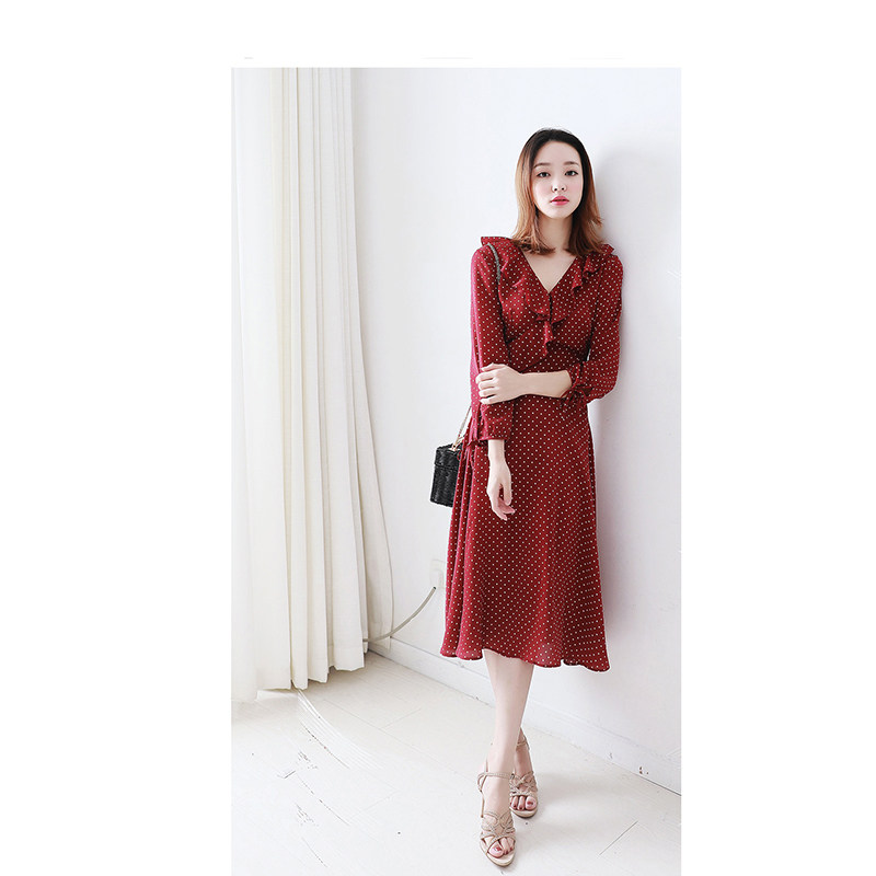 Day Faculty Early spring new light lavish retro elegant lining Skin Color White Retro Lotus Leaf Lace Trim Red Polo Dot Ocean Dress