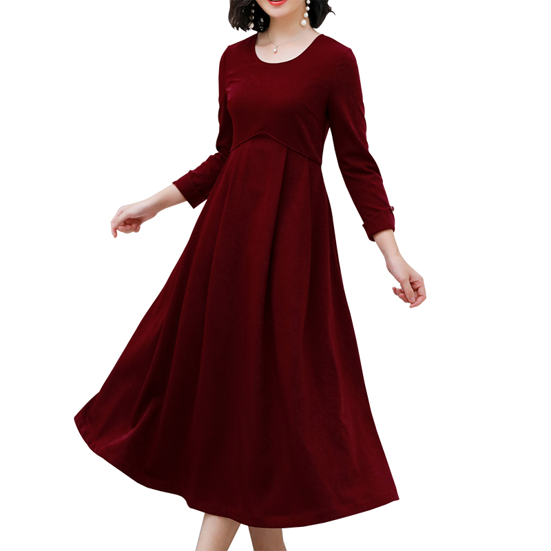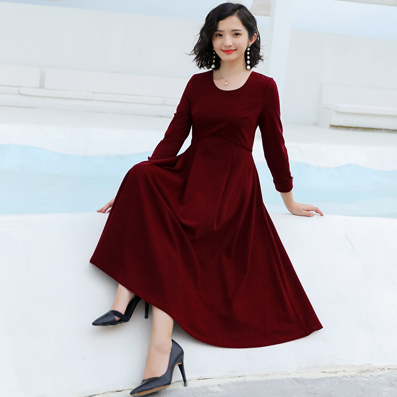 Red autumn Ocean dress woman long sleeve 2020 new display slim pure color minimalist temperamental length dress cashew waist large hem